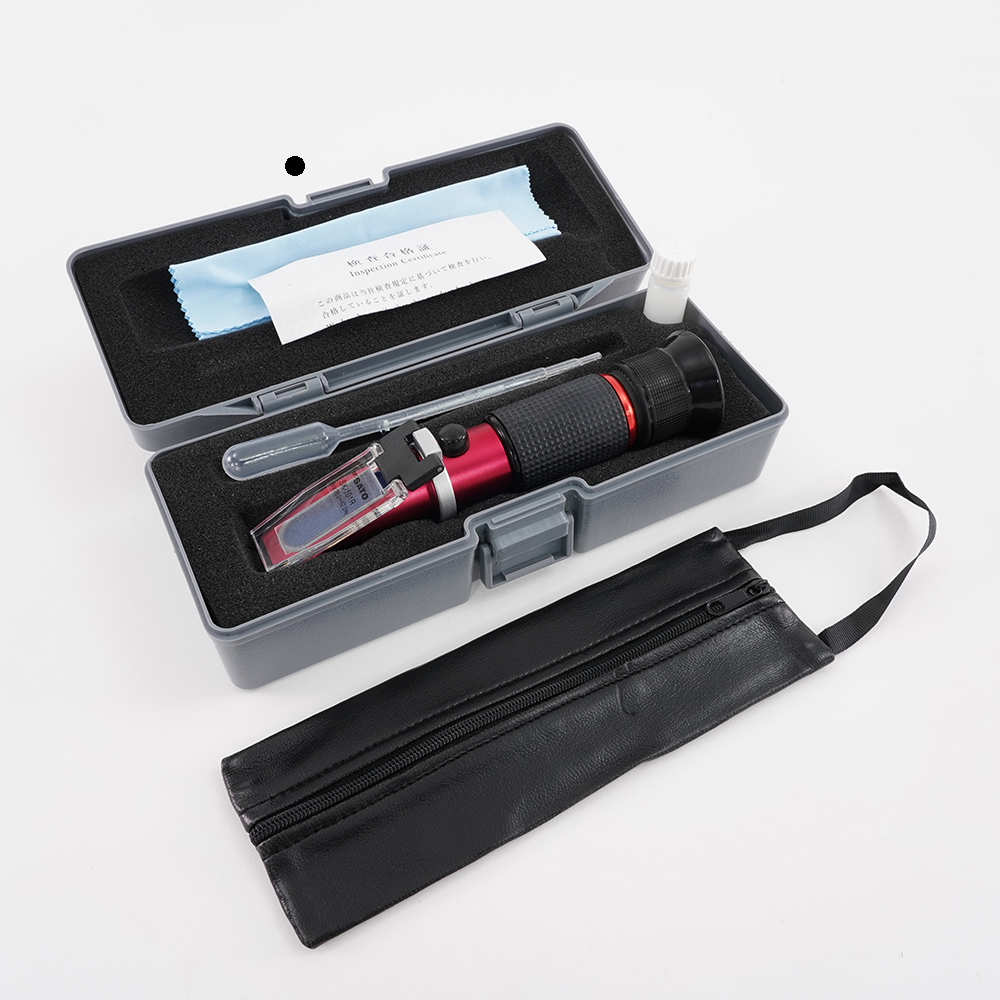 ●ソース、醤油、低糖ジャム、たれ、食用油などの中濃度液体を測定に最適 ●10~30℃間の自動温度補正機能付の為、温度を気にせず正しい測定 ができます ●見やすい目盛りを採用しています。●本体の軽量化をはかりつつ、環境に配慮した材質を使用しています。 (有害物質を使用していません)●測定範囲:BRix28.0~62.0%(糖度・濃度)●測定精度(%)(at20℃):±0.2●最小目盛:BRix0.2%●自動温度補正付(温度範囲10~30℃)●外形寸法:約Φ29(グリップ)●★材質:本体:アルミニウム合金、プリズム:光学ガラス、採光板:ポリカーボネート、グリップ、接眼鏡帯:合成ゴム●全長:約160mm●質量:約105g●付属品:スポイト、ドライバー、布、飽和塩水、本体収納ケース●コード番号:0181-00●●※ご注意:●▼※本製品は全反射の原理にもとづいた屈折率を利用し、液体濃度を測定する機器です。そのため、光を通さない液体(牛乳や白濁した切削油など)にはご使用できません。●▼※Brix(%)目盛は、ショ糖溶液100gの中に含まれるショ糖(g)をパーセントで表したもので、ショ糖濃度を意味します。他の物質を主体とした溶液で、特に定量的に濃度を知りたいときは換算表が必要です。
