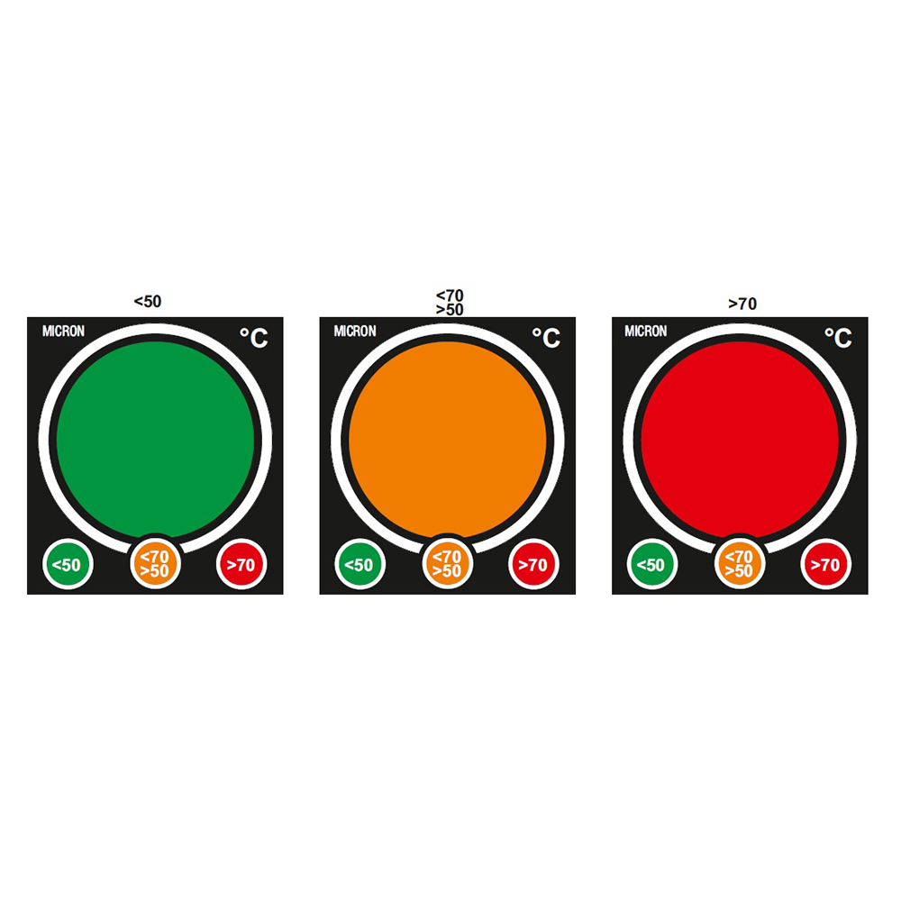 ●遠くからもひと目で状況把握!●信号機の様に温度変化を3段階で注意喚起●カプセル化された液晶を、ポリエステルフィルムに特殊印刷●電気の接続部分やバッテリーの過熱防止に●長時間の使用や摩擦、電子部品によって過熱する機械の温度監視●温度の遵守が必要な熱処理を含む製造工程で●サイズ:W48mm×52mm●入数:1ケース(10枚入)●温度レンジ:50℃以下:緑 50℃~70℃:黄 70℃以上:赤●可逆性●高精度な±1℃でシャープに変色●重金属等の有害物質は一切含まれておらず、安心してご利用いただけます。●※100℃以上の環境ではご使用になれません。●※屋内専用●RoHS指令/Reach適合商品