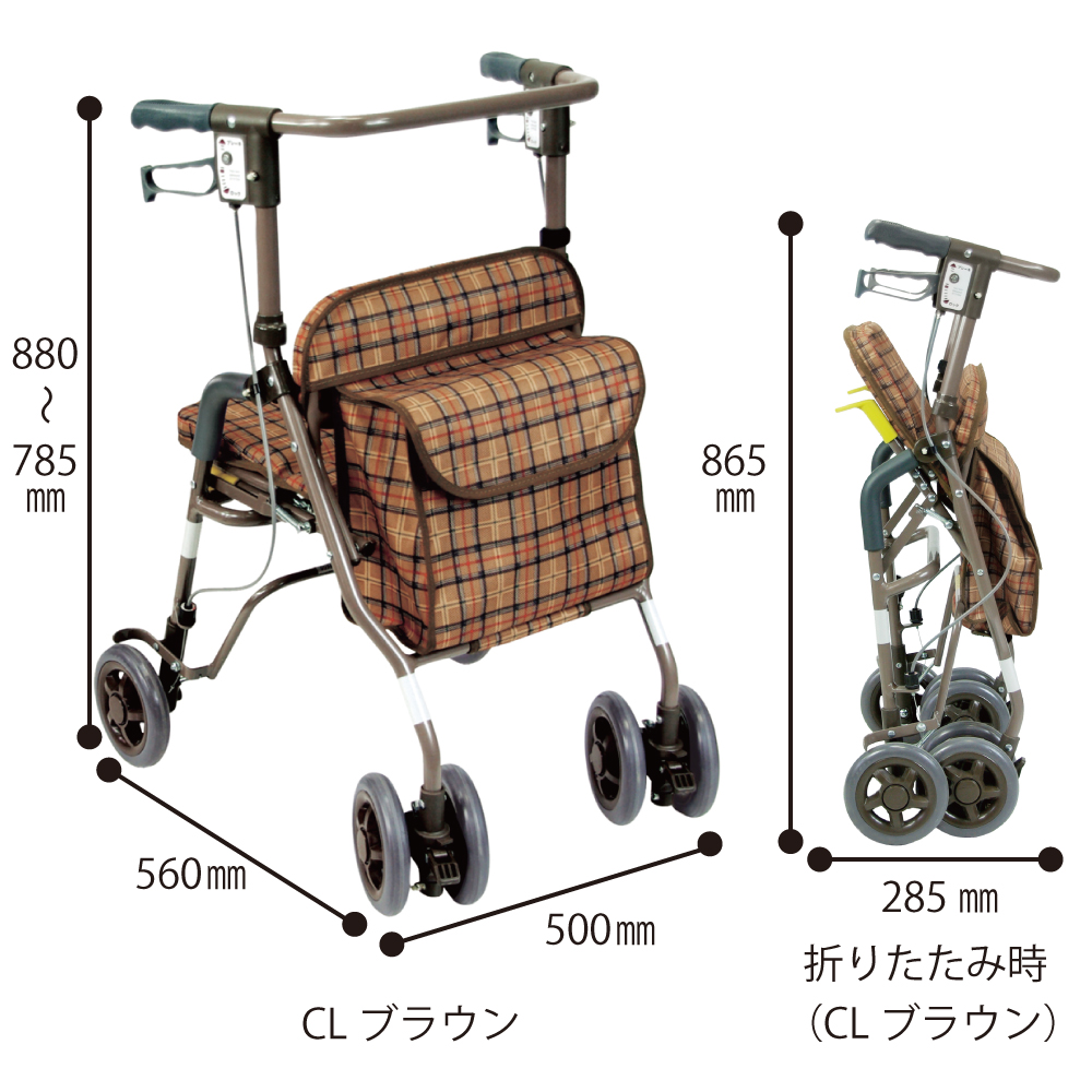 ●幅50cmとコンパクトで軽量です。折りたたみ可能です。●握ればブレーキ、下に押しさげると駐車ストッパーの2WAYブレーキです。●柄:CLブラウン●サイズ(mm):500×560×785~880●材質:本体/アルミ、タイヤ/EVA(硬質発泡車輪)、バッグ/ポリエステル●重量:5.9kg●高さ調節:4段階(ピッチサイズ30mm)●座面高:410mm●耐荷重:100kg●キャスター:φ145mm、2WAY(固定、左右各60度)●2WAYブレーキ