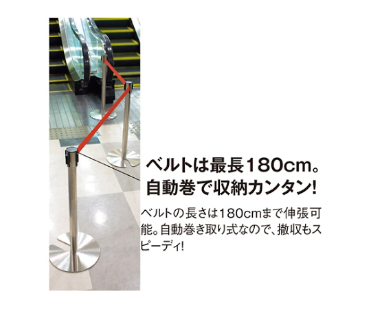 ●自動巻で収納カンタン!ベルトの長さは180cmまで伸張可能。●自動巻き取り式なので、撤収もスピーディ!キズ・サビに強いステンレス製ポール。●使用しない時にスタッキングができるので、収納スペースを取りません。●エッジを研磨処理し、安全性にも配慮。●ベースのスタッキング部にアール加工を施し、スタッキング性と安全性を高めました。●イベントやセールなど、お客様の誘導・導線確保に大活躍!●素材:本体:ステンレス製 ベルト:ポリエステル製●サイズ:ベース直径36×H80cm ベルト:L180cm●重量:5kg●組立式●片方ベルト+ベルト受け×3付き●4方向連結可●スタッキングタイプ●入数:1台