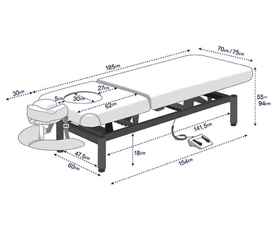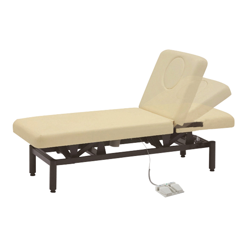 ●マットは優しく体を受けとめる低反発クッション●フェイスホール搭載。ホールにフェイスクッションをはめてうつ伏せ姿勢に対応できます。付属のアームレストを取付ければ、腕の置き場にも困りません。ベッドの端(頭側)にフェイスクラドルを挿し込めば身長が高いお客様にも対応可能。●高さ変更の操作は足元のペダル(リモコン)を踏むだけ。初高を低めに設計したので、乗り降りも負担なく行っていただけます。●ガス圧式を採用した背もたれのリクライニングはレバー操作で無段階に調整可能(手動)●サイズ:(全体)L185×W70×H55~94cm、(背もたれ部分)L62cm、(ベッド下有効内寸)H18cm●材質:表地/PU(ポリウレタン)レザー、クッション/低反発ウレタン●色:アイボリー●耐荷重:約150kg●重量:約55kg●電源:AC100V 50/60Hz●付属品:フェイスクッション・フェイスクラドル・アームレスト●※運送費・搬入費・据付費・組立費等が別途必要です。お問い合わせください。