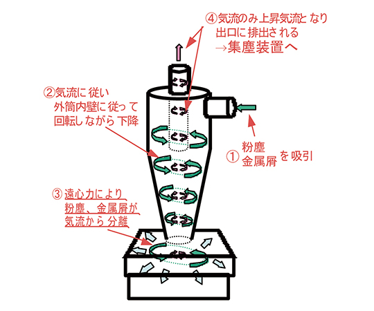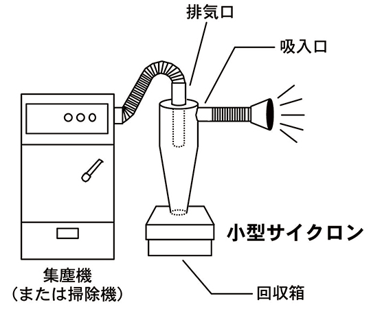●集塵装置・掃除機の吸引力を利用した粉じん回収機器。●集塵装置・掃除機のフィルター目詰まりが低減し、寿命が大きく向上します。●90%以上の高分離効率で空気と粉じんを分離。●軽量・コンパクト設計で、本体や回収箱の持ち運びが容易で置き場所を選ばない。●回収箱は本体にはめ込み式になっており、スピーディーな回収物処理が可能。●消耗部品不必要で、回収物の処理以外はメンテナンスフリー。●接続ホース×1本入り、内径φ38mmで一般的な掃除機に接続しやすい(掃除機パイプの形状によります)。●全体寸法:幅195x奥行160x高さ460mm●吸入・排出口径:φ38mm●重量:2.5kg●回収箱容量:2.3L●ご注意事項:①本品には集塵機・ブロアは付属しておりません。別途ご準備下さい。②引火性や粉塵爆発の恐れのある粉塵の吸引には絶対に使用しないで下さい。③引火性、爆発性、腐食性物質の霧・煙・ガスが滞留している場所や、これらの付近では使用しないで下さい。④使用中は多量の静電気が発生する場合がございますので、十分な静電気対策を行なった上でご使用下さい。●入数:1台