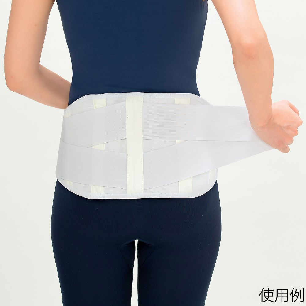 ●腰部固定帯。●医療現場で採用されている信頼の品質です。●洗濯可能。(手洗い。中性洗剤をご使用ください。)●上下対称構造のため、正面接着部分をご自身の使いやすい合わせ向き(右前or左前)で装着できます。●正面と補助ベルトの面ファスナー接着部分の端に、『take off zone』非接着部分があるため、着脱しやすくなっています。●伸縮部分・非伸縮部分ともに、通気性を重視したメッシュ素材採用してます。●4本のステーを体型に添うように腰部の中心にフィットさせることで効果的にサポートします。(※ステーは取外し出来ません)●弾力性のある特殊樹脂の為、追従性に優れています。体型ラインに密着させるため凸型断面になっています。●平ゴムタイプで伸縮性に優れています。腹斜筋に添った補助ベルトは腹圧を高め、下腹部を引き上げて腰部への負担を軽減します。●樹脂ステーの上から留めるため、よりフィット感が得られます。●動きやすさ・通気性・ホールド性の3つの機能をバランスよく実現した形状です。●腹部の幅を狭くしています。前屈制限が少なく、しかも胃に負担をかけません。●背部の幅が広くなっています。過伸展を防ぎ背筋を補助します。●色:ホワイト●サイズ:L(適応腰まわり90cm~105cm)●材質:ナイロン・綿・ゴム・ポリエステル・ポリウレタン・樹脂ステー