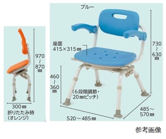 ●お尻の肉が痩せている方にも優しいやわらかい座面です。●座ったまま360度方向転換できます。●カラー:ブルー●材質:脚パイプ/アルミニウム、背もたれ・座面/PE(ポリエチレン)、クッション/EVA樹脂、高さ調整バネ/ステンレス●サイズ:485~520×485~570×630~730mm●おりたたみ時サイズ:485~520×300×870~970mm●座面サイズ:415×315mm●座面高さ:360~460mm(20mmピッチ・6段階調整)●梱包サイズ(mm/幅×奥行×高さ):850×500×315●座面回転:360度(45度毎ロック)●重量:6.4kg●パイプ先端径:φ29mm●耐荷重:100kg●座面回転式●肘掛可動式●折りたたみ式●※介護保険適用対象品(特定福祉用具)