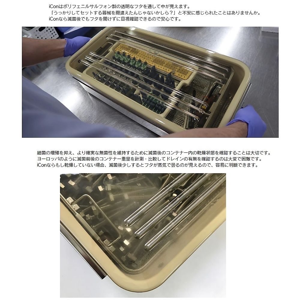 ●軽くて中が見える滅菌コンテナー●フィルタ交換不要●プラズマ滅菌にも対応●安心の5年保証●優れたバクテリアバリア性●「見えるインジケータ」付き(市販のケミカルインジケータを差し込めば、滅菌直後に内部の滅菌有効性を確認できます。)●滅菌時の真空工程で自動的にボタンが出てロックされるオートロック機能付きです。●材質:本体・フタ/PPSU(ポリフェニルサルホン)、フィルター/ステンレス(SUS316L)●オートクレーブ・EOG・プラズマ滅菌・過酸化水素滅菌可●安全保存期間:6ヶ月●フィルターバクテリアバリア性:97.4%(参考:他社製ペーパーフィルター69.0%)●フィルター耐久性:滅菌/5000回滅菌後の目詰まり約4% フィルター面積50%でも滅菌可能●サイズ:285×294×105mm