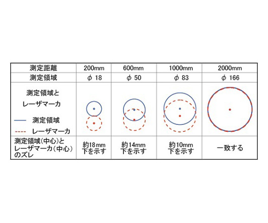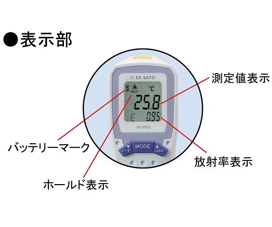 ●防塵、防水構造の放射温度計で、濡れた手でも操作可能です。●サークルタイプのレーザマーカのため、測定箇所の目安が容易に確認できます。●非接触ですばやく表面温度が測定できます。●触れずに測れるから衛生的。●高温、高所、危険なものも安全に測れます。●放射率は 0.01単位で設定できます。 正しく測定するためには、測定対象物に合わせた放射率の設定が必要です。●設定した上限値、下限値を超えたときにブザーでお知らせします。●MAX(最高温度)、MIN(最低温度)、AVG(平均値)、DIF(MAXとMINの温度差)を表示できます。●オート測定機能付。測定トリガーを離した状態で連続測定が可能です。●暗い場所でも温度指示値が読み取れる液晶バックライト機能付です。●オートパワーOFF機能付。自動的に電源が切れるので、電源切り忘れによるバッテリーの消耗を防ぎます。●消費生活用製品安全法携帯レーザ応用装置PSCマーク付です。本器はクラス2レーザ製品に該当し、PSCマーク付です。●測定範囲:-60℃~550℃●測定精度:±2℃または2%readingの大きい方:0.0~550℃ / ±(2℃+5%reading):それ以外 / ※条件:測定環境温度23℃±3℃ 放射率0.95のとき●分解能:0.1℃●放射率:ε= 0.10~1.00の範囲において0.01単位で設定可能●距離係数:D:S=約12:1(D:測定距離、S:測定領域直径)●検出素子:サーモパイル●測定波長:8~14μm●レーザマーカ:赤色サークルレーザ(クラス2 レーザ製品)、波長/650nm、出力/1mW以下 ※消費生活用製品安全法:携帯用レーザ応用装置に適合(PSCマーク付)●防水・防塵:JIS C 0920 IP54に準拠●使用環境条件:0~50℃、85%rh以下(結露なきこと)●保管環境条件:-10~50℃(結露なきこと)●電池寿命:連続測定時/約14時間 ※アルカリ電池使用、レーザマーカ・バックライトともにONのとき●材質:ABS樹脂、シリコン樹脂●寸法:約(W)42×(H)143×(D)80mm●質量:約196g(電池含む)●付属品:単4形アルカリ乾電池(LR03)×2本、取扱説明書×1部、ネックストラップ×1本