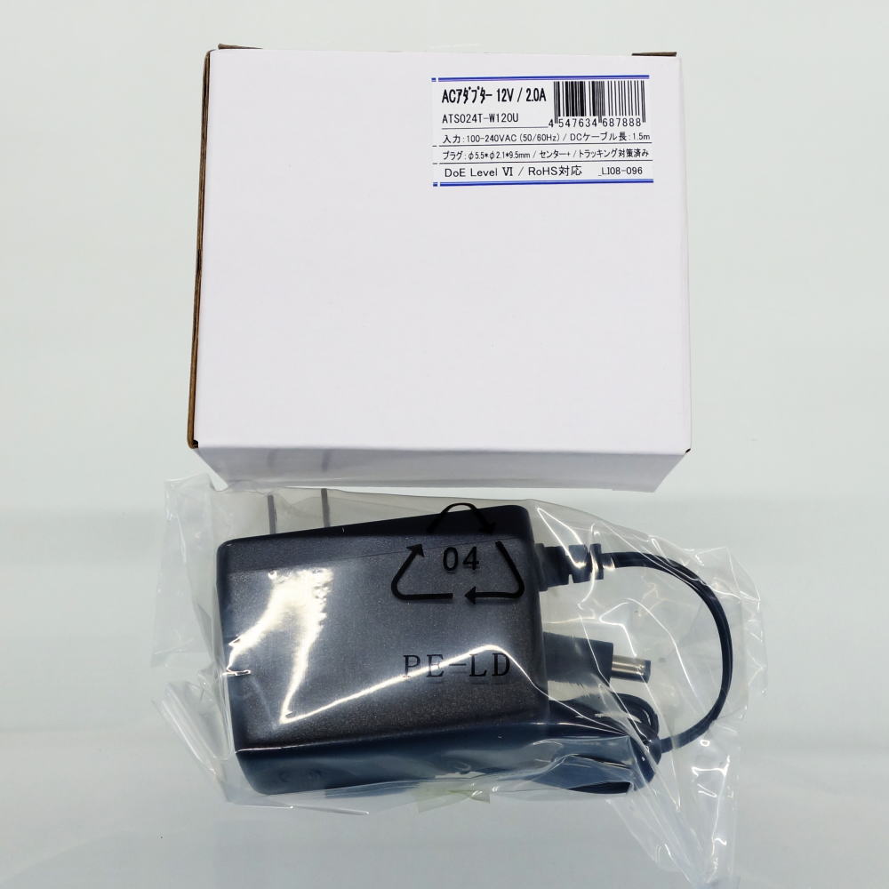 ●24W(出力12V/2A)でワールドワイド対応(AC100~240V入力)のスイッチング方式ACアダプターです。出力端子は採用数の多いφ2.1mmのセンタープラス型で、トラッキング対策品です。使用する際には、出力端子の形式と極性にご注意ください。出力端子の形式はデータシートの一覧表を参考にしてください。●主な仕様●入力電圧(50/60Hz)100-240VAC●入力電流0.58A●出力電圧12V●出力電流2A●動作温度範囲0℃~40℃●保存温度範囲-20℃~80℃●DCプラグ形状内径:φ2.1 / 外径:φ5.5 / 先端長:9.5mm / フォークタイプ●極性センタープラス●DCケーブル長1.5m●DCケーブル規格UL2468 AWG22●本体サイズ72(L) x 34(W) x 69(H)mm●重量170g●外部電源規制DoE Level Ⅵ 準拠●PSE●トラッキング対策●RoHS(EU)2015/863●REACH●紛争鉱物調査●難燃性規格UL 94V-0●適合ジャック32753PAE、DCJ2.1-1.8M、MJ-077N、MJ-10、MJ-14、MJ-21などに適合