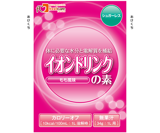 ●体に必要な水分と電解質を補給。●水分だけでなく失われたイオン(電解質)も効率よく補給できます。●体液に近い浸透圧です。(276mOsm/kg・H2O)●シュガーレスです。(糖類0g)●カロリーオフです。(10kcal/100mL:1L溶解時)●水1Lに1袋溶かすだけで簡単に作れます。●もも風味●原材料名:マルチトール、食塩、コンブエキス、パラチノース、調味料(アミノ酸)、酸味料、塩化K、甘味料(アセスルファムK、スクラロース)、乳酸Ca、炭酸Mg、香料、着色料●アレルギー(特定原材料等27品目):該当なし●入数:34g×100袋/ケース●賞味期限:製造後1年●無果汁●※本製品は日本国内のみの販売とさせていただきます。