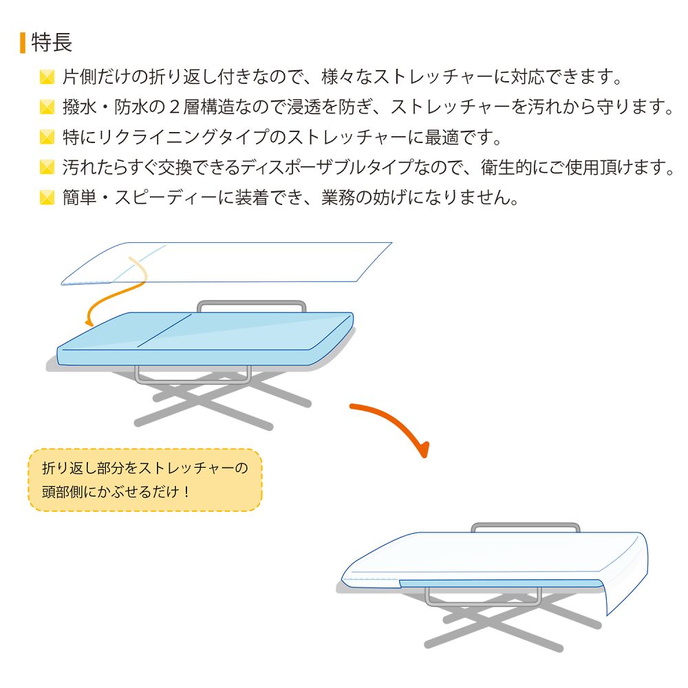 ●片側だけの折り返し付きなので、様々なストレッチャーに対応できます。●撥水・防水の2層構造なので浸透を防ぎ、ストレッチャーを汚れから守ります。●特にリクライニングタイプのストレッチャーに最適です。●汚れたらすぐ交換できるディスポーザブルタイプなので、衛生的にご使用いただけます。●簡単・スピーディーに装着でき、業務の妨げになりません。●サイズ:77cm×230cm(折り返し部分30cm)●材質:撥水部/PP(ポリプロピレン)不織布、吸水部/レーヨン不織布、防水部/PE(ポリエチレン)ラミネート加工●入数:1箱(1枚入×20袋)