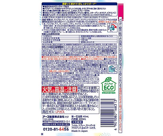 ●朝使って夜まで1日しっかりガード●※大量に汗をかいた後やタオルで拭いた後などは、こまめにぬりなおしてください。●▼独自の虫よけロングキープ処方●▼パウダーインでお肌サラサラやさしいつけ心地、さらに汗や水に強く流れにくい●▼3つ穴噴口採用で舞い散りにくく、ムラなくスプレーできる●▼お肌にやさしい4種のうるおい成分配合(ヒアルロン酸Na、コラーゲン、セラミド、ビタミンC)●▼皮膚アレルギーテスト済み(全ての方にアレルギーが起きないというわけではありません。)●お肌の虫よけ●シューっとラクちんベタつきにくい●無香料●Act For ECO・植物由来原料使用●【販売名】サラテクトAy1●【効能・効果】蚊、ブユ(ブヨ)、アブ、ノミ、イエダニ、マダニ、サシバエ、トコジラミ(ナンキンムシ)、ヤマビルの忌避●【防除用医薬部外品】●商品サイズ:幅/53mm、奥行/53mm、高さ/174mm●重量:200g●内容量:200mL●成分●▼【有効成分】1缶(200mL)中ディート4g(原液換算10%)●▼【その他の成分】無水ケイ酸、DPG、ヒアルロン酸Na(2)、アスコルビン酸(ビタミンC)、加水分解コラーゲン末、ステアロイルフィトスフィンゴシン(セラミド)、グリセリン脂肪酸エステル、無水エタノール、LPG、その他1成分●香り:無香料●薬事分類:防除用医薬部外品●効果効能:蚊、ブユ(ブヨ)、アブ、ノミ、イエダニ、マダニ、サシバエ、トコジラミ(ナンキンムシ)、ヤマビルの忌避
