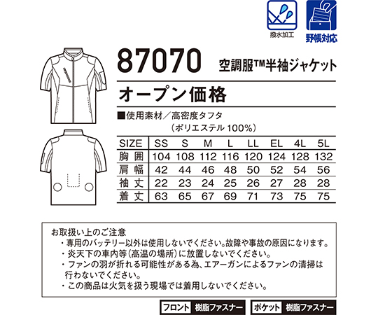 空調服半袖ジャケット シルバー EL 87070