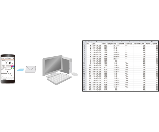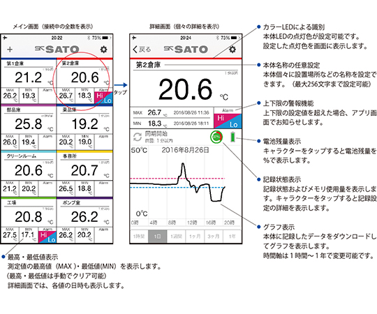 ●本製品は電波法適合製品です。●スマートフォンやタブレットで離れた場所から温度を確認できます。●測定値を記録し、専用アプリでデータやグラフを確認でき、データはCSVファイルとしてメール送信が可能なため、パソコンでの保存・解析が可能です。●端末1台で最大8台の本体を同時に接続できます。警報機能付き(上下限設定値を超えた時に専用アプリにお知らせします。)●ケーブル付としたことで、水中や壁の隙間等に感温部を挿入して使用出来ます。また、センサは先トガリ形状の為、土壌に突き刺して使用も可能です。※本体を水没させての使用は不可です。●SK-320BTと同様に、日本国内専用のため海外でのご使用できません。●温度センサ:サーミスタ●測定範囲:-50.0~150.0℃※センサ部(パイプ+コード)は、常時水没して使用可。その際の測定範囲は0~100℃となります。●精度:±1.0℃(0.1~40.0℃)、±1.5℃(-15.0~0.0℃、40.1~65.0℃)、±2.0℃(-30.0~-15.1℃、65.1~150.0℃)、±3.0℃(-50.0~-30.1℃)●分解能:0.1℃●記憶容量:8960データ●測定間隔:1・5・10・15・30・60分●サンプリング:約60秒(通信は1.2秒毎)●無線規格:Bluetooth5.1(無線認証番号:018-140077)●無線周波数:2402~2480MHz●通信距離:約30m(遮蔽物のない見通しの良い直線の場合)●防水性:IPX5(本体)/IPX7(センサ部)●使用環境:-15~65℃(結露なきこと)●電源:単3形アルカリ電池3本または、単3計リチウム電池3本●電池寿命:約1年(記録間隔60分、LED明るさ設定3、常温設定、アルカリ電池使用時)●材質:ケース/ABS樹脂、ラバー(ケース上部)/TPE樹脂、感温部/SUS304 コード/シリコン●寸法:本体/約(φ)68×(H)98mm、感温部/約φ4×100mm(先トガリ)、コード/約φ3×2m●質量:約194g(電池含む)●付属品:取扱説明書、単3形アルカリ電池3本、スタンド(着脱可)1個、ハンドストラップ1本●アプリケーション:SKSATO 320BT●注意:専用アプリは下記機種およびOSに対応しておりますが、全ての端末での動作を保証するものではありません。●対応機種:iPhone/iPad/iPad mini/Androidスマートフォン/タブレット●対応OS:iOS 9.0以上、Android 5.0以上●無線機能:Bluetooth 4.0を搭載していること●※端末は別途、ご用意願います。●コード番号:No.8440-20