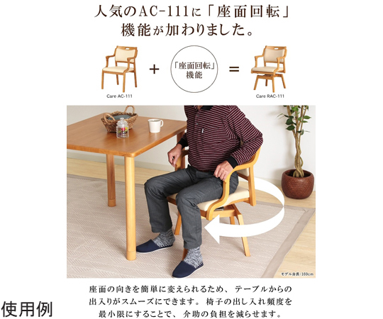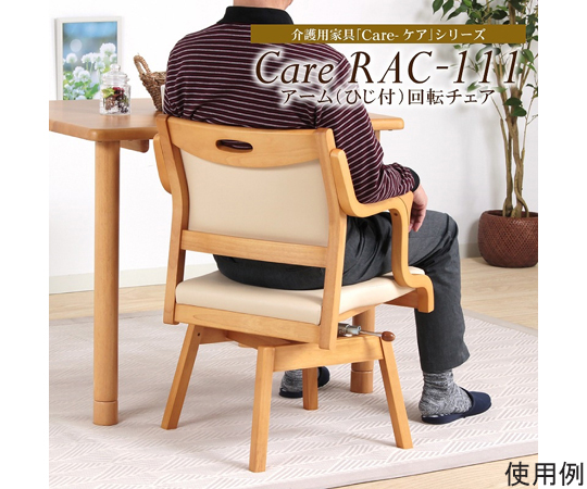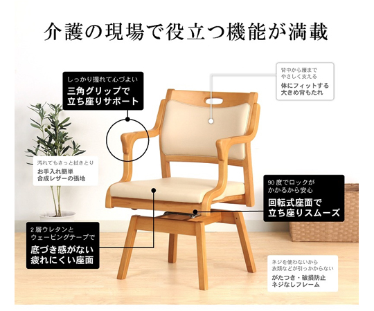 ●座面を回転させることで、椅子を出し入れすることなく立ち座りがスムーズにでき、介助が楽に行えます。●座面ロック機能が付いているため、安全性にも配慮されています。●座面を回転させると90°ごとにレバーが自動で上がり、ロックがかかります。●360°回転椅子としてのご使用が可能です。身体の向きを座面ごと変えることができ、お好きな位置から立ち座りが出来るため、より快適にお過ごしいただけます。●大きめに設計された背もたれが、背中から腰まで優しくフィットします。●座面は前に向かって末広がりの形状になっており、男性でもゆったりと座ることができます。●底づき感がない疲れにくい座面です。●三角グリップで立ち座りをサポート。●衣類などが引っかからず、ネジのゆるみによる「がたつき」「破損」を防ぐネジなしフレームです。●フレーム:ライトブラウン●シート:アイボリー●材質:フレーム/天然木(ラバーウッド)ウレタン樹脂塗装、クッション材/ウレタンフォーム、張地/PVCレザー(耐アルコール・耐次亜塩素酸・防汚・難燃)●サイズ:510×540×785mm●座面高さ:420mm●座面奥行:460mm●ひじかけ高さ:615mm●重量:約7kg