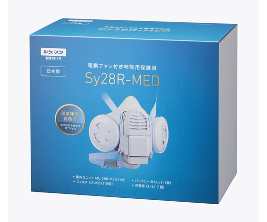 ●コロナ重症者受け入れ施設に適しています。安全、快適な作業を支援します。●呼吸連動形のマスクで、呼吸が楽にできます。●面体内を常に陽圧(正圧)に保つため、面体がズレても、ウイルス等を吸入するリスクを低減します。●フィルタは、N95マスクと同等の性能があります。●薄型のフィルタ・スリムデザインで、フェイスシールドと併用がしやすい形状です。●保護めがねとの併用もできます。●マスク本体×1台、フィルタ×10個のセット品です。●型式検定合格番号:第TP76号●型式の名称:Sy28R-MED●粒子捕集効率:95.0%以上(PL1)●漏れ率:B級(5.0%以下)●電源:専用バッテリー(付属)●充電時間:約3.5時間●セット内容:本体(面体部、しめひも)、インナースポンジ、バッテリー、充電器、X2-MEDフィルタ(フィルターガード付)×10個●サイズ:M