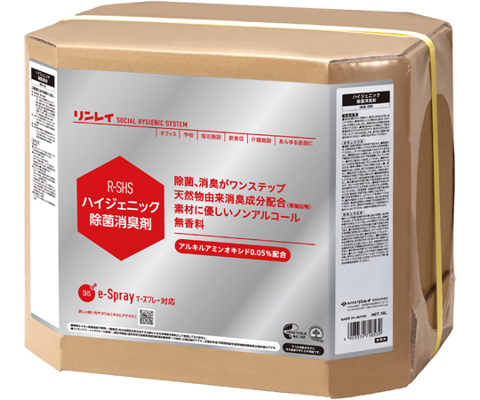 ●除菌剤としてアルキドアミンアキシド配合です。●ノンアルコールです。●タバコ、トイレ臭等の除菌消臭ができます。●中性タイプです。●容量:18L/箱●原液使用●RECOBO※バックインボックス●成分:非イオン系界面活性剤(アルキルアミンオキシド0.05%)、グリコール系溶剤、ビルダー、除菌剤(カチオン系)、消臭成分(柿抽出物)