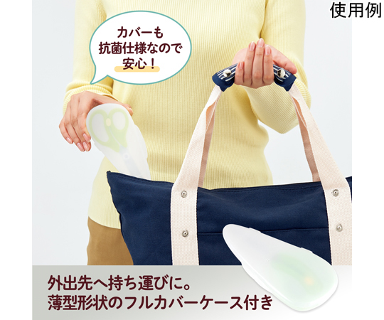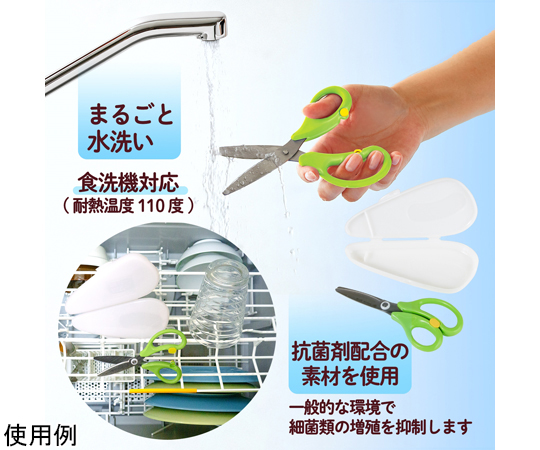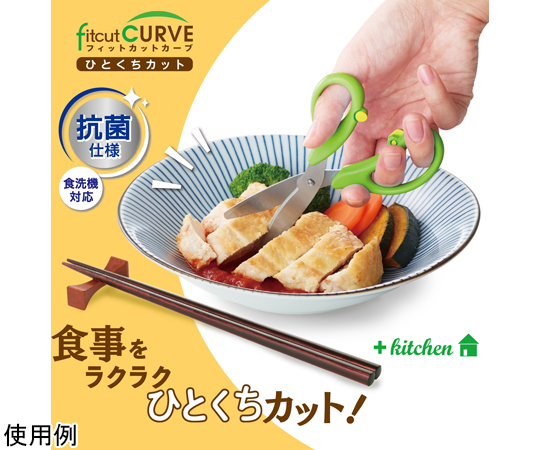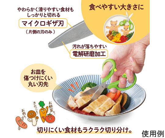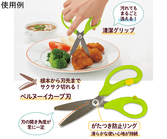 ●いつもの食事を食べやすく、ひとくちサイズにらくらくカット。●食材をらくらくカット…金属製なので、樹脂製のはさみと違い、お肉や繊維質の野菜なども簡単にカットすることができます。●ベルヌーイカーブ刃&マイクロギザ刃加工で、食材もしっかり切れる●いつでもキレイなクリーン仕様…水や洗剤に強い清潔グリップと汚れが落ちやすい電解研磨加工を採用。いつもキレイに、安心して使えます。●食洗機対応(家庭用)…本体・ケース対応●持ち運びに便利…ケース付きなので、外食の時にもさっと取り出して使うことができる。●チャイルドロック付。※冷凍及び半解凍食品、骨、蟹や海老の厚い殻、貝殻、餅などの厚い乾燥食品、金属、針金、その他金属相当の硬いものを切らないでください。●※たわしや磨き粉で洗うと傷がつく恐れがあります。●※漂白、消毒、つけ置き洗いはしないでください。●カラー:グリーン●長さ:145mm●刃渡り:51mm●板厚:1.5mm●材質:グリップ/PP、刃・カシメピン/ステンレス鋼、がたつき防止リング・ロックボタン/POM、ケース/PP