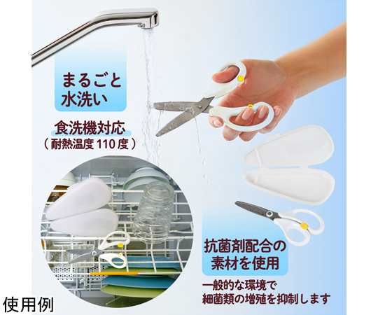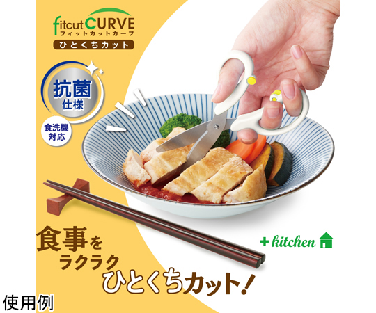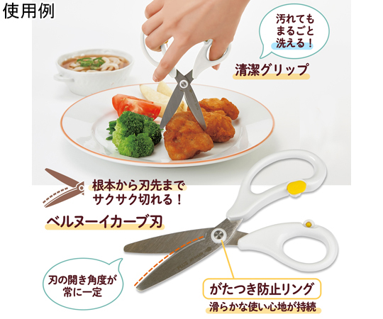 ●いつもの食事を食べやすく、ひとくちサイズにらくらくカット。●食材をらくらくカット…金属製なので、樹脂製のはさみと違い、お肉や繊維質の野菜なども簡単にカットすることができます。●ベルヌーイカーブ刃&マイクロギザ刃加工で、食材もしっかり切れる●いつでもキレイなクリーン仕様…水や洗剤に強い清潔グリップと汚れが落ちやすい電解研磨加工を採用。いつもキレイに、安心して使えます。●食洗機対応(家庭用)…本体・ケース対応●持ち運びに便利…ケース付きなので、外食の時にもさっと取り出して使うことができる。●チャイルドロック付。※冷凍及び半解凍食品、骨、蟹や海老の厚い殻、貝殻、餅などの厚い乾燥食品、金属、針金、その他金属相当の硬いものを切らないでください。●※たわしや磨き粉で洗うと傷がつく恐れがあります。●※漂白、消毒、つけ置き洗いはしないでください。●カラー:ホワイト●長さ:145mm●刃渡り:51mm●板厚:1.5mm●材質:グリップ/PP、刃・カシメピン/ステンレス鋼、がたつき防止リング・ロックボタン/POM、ケース/PP
