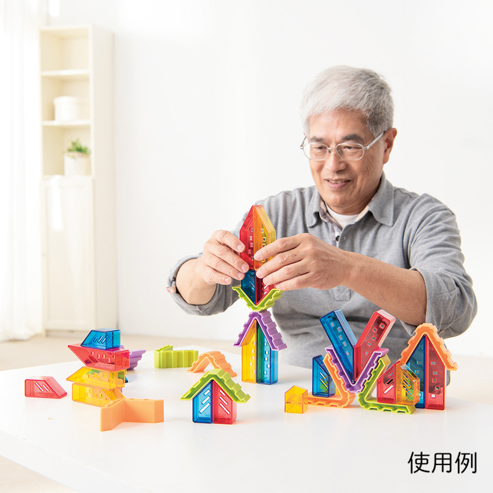 ●遊びながら楽しくリハビリテーションが出来ます。●目と手の協応や巧緻性を養えます。●光をあてて影絵を見たり、角度の勉強が出来るのでお子様と一緒にも楽しめます。●デザイン性抜群の透明ブロック。●材質:透明ブロック/ポリカーボネート、屋根パーツ/ポリプロピレン●寸法:透明ブロック小/57×28×27mm、透明ブロック大/105×28×27mm、屋根パーツ小/90×27×38mm、屋根パーツ大/87×30×62mm●入数:1箱(2セット組72個入)●質量:2.4kg●セット内容:透明ブロック小(赤・青・黄)各8個、透明ブロック大(赤・青・黄)各8個、屋根パーツ小(緑・紫・オレンジ)各4個、屋根パーツ大(緑・紫・オレンジ)各4個