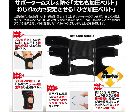 ●【サポーターのズレを防ぐ】 太ももを加圧する伸縮性の高いベルトを採用する事によりサポーターのズレを防止します。●【ひざ周りのコイルボーン】 左右にコイルボーンを採用する事で、ひざ関節のグラつきと内反外の動きも制御され、左右・前後の固定力が高まります。●【縦横伸縮素材】横160%・縦120%の伸びがあり、ひざを包み込むようなフィット感としっかり感を実現しました。●規格:M-Lサイズ●ひざ上周囲:33~45cm●材質:本体/ポリエステル、ナイロン、ポリウレタン、ボーン/スチール