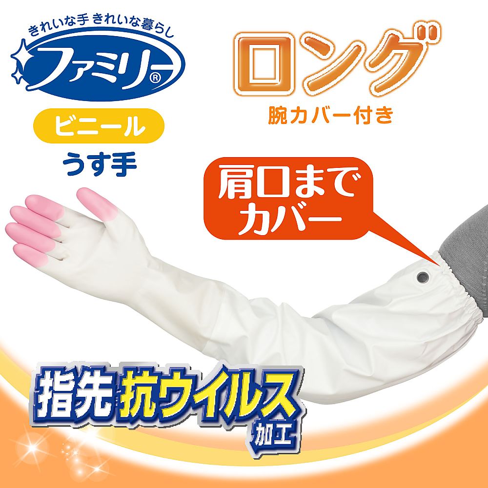 ●うす手タイプなので細やかな作業に適し、指先を強化しているので、やぶれにくく丈夫です。●手袋全体の抗菌効果に加え指先は抗ウイルス加工により表面についたウイルスを99%以上減少させます。●内側の抗菌・防カビ成分がニオイの原因となる雑菌・カビの繁殖を防ぎ衛生的です。●肩口までの腕カバーがついたロングタイプのため、腕全体を水や汚れから守ります。●洗剤・漂白剤に強い塩化ビニール樹脂製です。●サイズ:M●色:ピンク●全長(mm):630●入数:1双●材質:PVC(塩化ビニル樹脂)●全長:630mm●掌周り:200mm●中指長さ:74mm●指先抗ウイルス加工●ドライタッチ加工