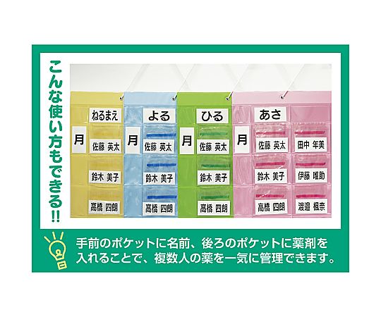 ●薬の出し入れがしやすい中身の見えるおくすりカレンダー。●マチ無しダブルポケットで使い方いろいろ。●8段あるので投薬日翌日からの1週間分をセットできます。●用法・曜日はカード式なのでアレンジ自由。●上部に厚紙が入っているので形が崩れにくくなっています。●サイズ:縦680×横433mm●ポケット(後):縦68×横94mm●ポケット(前):縦58×横94mm●材質●▼本体:PVC(塩化ビニル)●▼カード:紙●▼ひも:ナイロン●付属品:用法カード(4種)、曜日カード(7種)、吊り下げ用ひも●重量:約225g●日本製●コード番号:76251-102