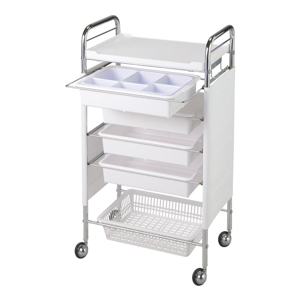 ●ワイドサイズの天板を使用した収納力が高いワゴンです。●サイドカバー付きでゴミの侵入を軽減します。●静粛性が高く、滑らかな動きのウレタンキャスターを使用しています。●収納に便利な脱着式中仕切り1段とサイドフック1個が付いています。●色:ホワイト●幅×奥行×高さ(mm):483×300×865●重量(kg):9.5●材質:フレーム/スチールクロームメッキ、天板/ABS樹脂、パット・カゴ・サイドカバー/PP(ポリプロピレン)●天板サイズ:445×300mm●パットサイズ:外寸法/365×275×55mm、内寸法/320×220×53mm●カゴサイズ:外寸法/380×295×95mm、内寸法/323×230×84mm●キャスター:単輪Φ50mmウレタン製●耐荷重:20kg●付属品:パット×4個、中仕切り×1個、カゴ×1個、サイドフック×1個