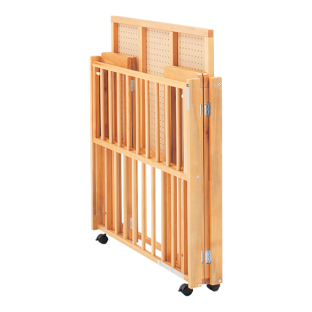 ●安全ロック付きの上下スライド扉仕様で、床面は2段階の高さに変えられます。●キャスターが付いているため、移動が容易です。●使用しない場合は、コンパクトに折りたためます。●幅×長さ×高さ(mm):660×950×885●重量(kg):15●★入数:1個●材質:本体/ブナ(ウレタン塗装)、床材/有孔ボード、マット/綿100%(芯材:再生ウレタン)●折りたたみ時サイズ:950×150×1050mm●床面高:480・180mm(2段階)●キャスター:φ40mm(2輪ストッパー付き)●対象年齢:0~24ヶ月●シックハウス対応●付属品:マット(900×600×40mm)●組み立て式(要工具)●※ベッドに66-0015-43 ベッド用安全メッシュカバーは付属していません。