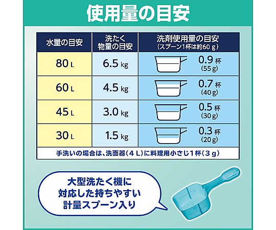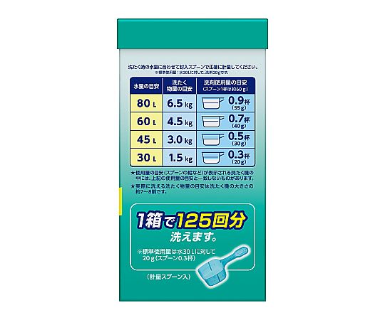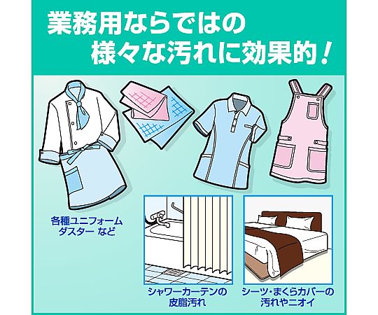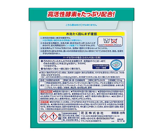 ●高活性酵素パワーで高い洗浄力を実現。●タンパク質分解酵素を従来品比(ビッグバイオ酵素比)約4倍増量。●魚・肉の血液などのタンパク汚れや、油・調味料汚れまで優れた洗浄力でパワフルに洗い上げます。●ニオイの原因となる皮脂汚れもしっかり落とします。●ニオイの原因は、目に見えない皮脂汚れ。皮脂汚れをしっかり落とすことが、ニオイを防ぐポイントです。●洗浄後、強い香りが残らない微香タイプ。●大型洗たく機に対応した計量スプーン1個入り。●粉末タイプこんな汚れに効果的●▼肉・魚の血液などのタンパク汚れに。●▼ダスターなどについた油、調味料汚れに。●▼衣類や食事エプロンなどの食べこぼし汚れに。●〔使用上の注意〕:用途外に使わない。●子供の手の届く所に置かない。●認知症の方などの誤食や他の事故を防ぐため、置き場所に注意する。●使用後は手を水でよく洗う。●荒れ性の方や長時間使う場合、また洗剤をブラシにつけて洗う時は炊事用手袋を使う。●落下・転倒する所に置かない。●水に溶かして密閉容器に保管しない。 酸素が発生し、内圧が上がることがある。●〔応急処置〕:粉末が目に入った時は、こすらず直ちに流水で15分以上洗い流し、直後に必ず眼科医の診断を受ける。●少量の粉末または洗剤溶液を飲み込んだ時は、吐かずに口をすすぎ、水を飲むなどの処置をする。異常が残る場合は、医師の診断を受ける。●大量に口や鼻に入った時は、直ちに医師に連絡、相談する。※受診時は本品またはSDSを持参する。●用途:綿・麻・合成繊維用●液性:弱アルカリ性●成分:●▼界面活性剤【25%、直鎖アルキルベンゼンスルホン酸ナトリウム、アルキル硫酸エステルナトリウム、ポリオキシエチレンアルキルエーテル】●▼水軟化剤(アルミノけい酸塩)、アルカリ剤(炭酸塩)、分散剤、工程剤、漂白剤、蛍光増白剤、酵素●内容量:2.5Kg/箱