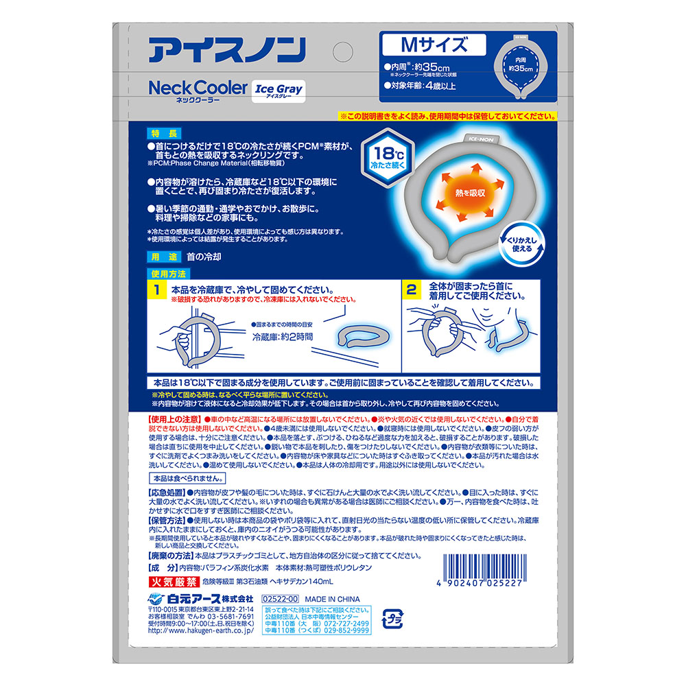 ●首につけるだけで18℃の冷たさが続くPCM素材が首もとの熱を吸収するネックリングです。●結露しにくく、首や衣類がぬれにくい仕様です。●内容物が溶けたら、冷蔵庫など18℃以下の環境に置くことで、再び固まり冷たさが復活します。●結露しにくく、首や衣類が濡れにくい仕様です。●くり返し使用できます。●暑い季節の通勤・通学やおでかけ、お散歩に。●料理や掃除などの家事のときにも。●※冷たさの感覚は個人差があり、使用環境によっても感じ方は異なります。●サイズ:L(内径:約38cm)●材質:中身/パラフィン系炭化水素、カバー/熱可塑性ポリウレタン●重量:135g
