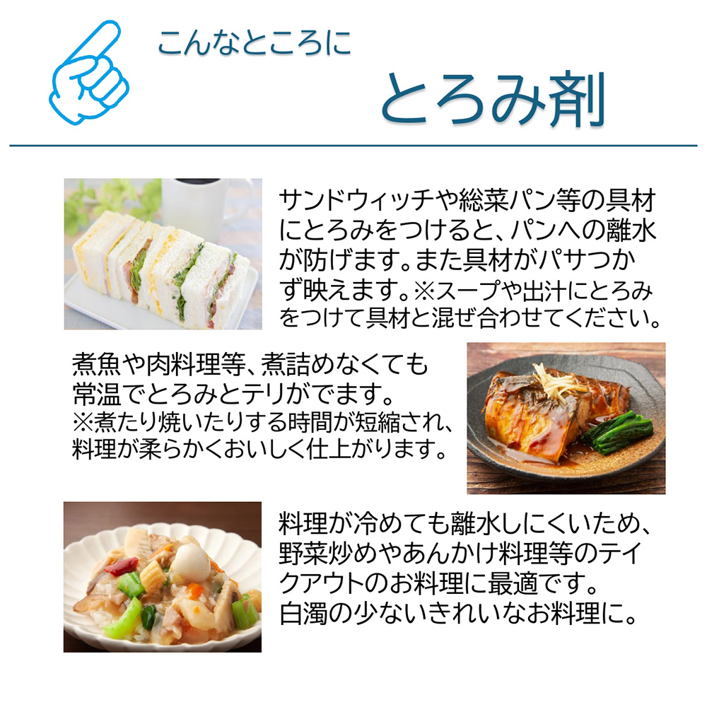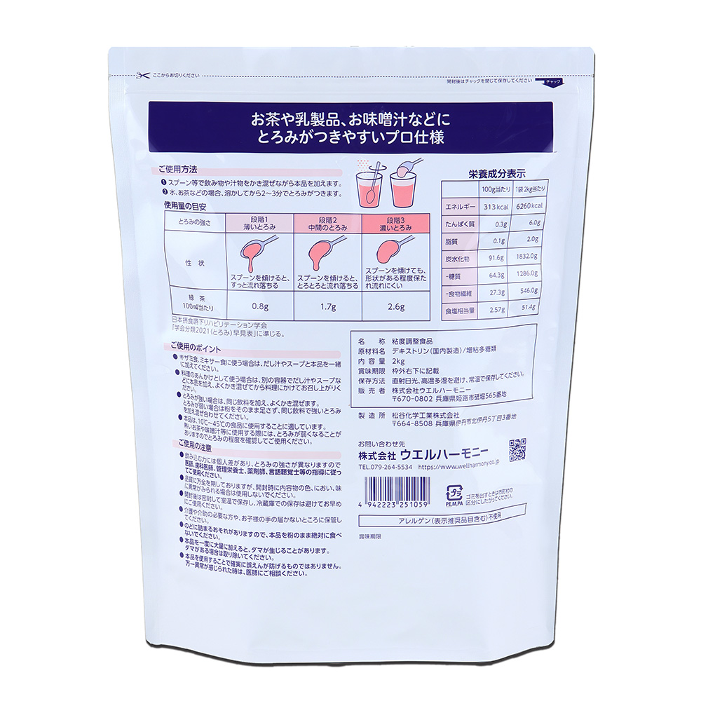 ●お茶や乳製品、味噌汁などにとろみがつきやすく、優れたコストパフォーマンスを実現したプロ仕様です。●とろみの立ち上がりが早く、調理の時間が短縮できます。●少量でしっかりとしたトロミに仕上がります。●入数:1パック(2kg入)●原材料名:デキストリン・増粘多糖類●成分(100g当たり):エネルギー313kcal・たんぱく質0.3g・脂質0.1g・食塩相当量2.57g・炭水化物91.6g・糖質64.3g・食物繊維27.3g●保存方法:直射日光、高温多湿を避けて室温保存●冷温両用●スタンドパック