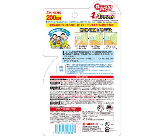 ●1回噴射で蚊成虫には約12時間、ハエ成虫には約4時間効果が持続します。●1プッシュで薬剤がお部屋に広がり、約12時間蚊を駆除します。●これ1本で、お部屋、玄関、廊下など、お家の中のあらゆるところに使えます。●火も電気も使わないので、お子様、犬、ネコのいるご家庭でも安心して使えます。●<蚊に効く独自のメカニズム>パワフル噴射でいきわたる→壁や天井に付着する→そこに蚊がとまって、ダウン●<蚊の習性を応用したキンチョウ独自のメカニズム>実は…蚊は 壁や天井にとまっている時間が長い!ミクロレベルの粒子研究による壁や天井に薬剤が付着しやすい設計。そこに蚊がとまって効果を発揮。壁にとまる蚊をまちぶせ!だから 蚊がいなくなる!※使用環境により効果は異なります●【効能】蚊成虫及びハエ成虫の駆除●寸法 幅120mm×高さ211mm×奥行38mm●容量:45mL●使用の目安:4.5畳~8畳あたりに1プッシュ。●対象害虫:蚊成虫・ハエ成虫●有効期間:蚊成虫には約12時間・ハエ成虫は約4時間。●有効成分:ピレスロイド(トランスフルトリン)●単位:1本●荷姿 幅292mm×高さ236mm×奥行257mm●防除用医薬部外品