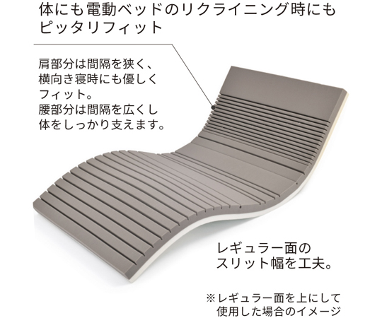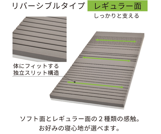 ●独自のカッティングにより、寝心地にこだわったリバーシブルタイプ介護用サイズ(91cm幅)マットレスです。●サイズ:幅910×長さ1910×厚み80mm●重量:約4.9kg●外装生地の組成:側地/ポリエステル100%、中袋/ポリエステル100%、材料/ウレタンフォーム(2層構造)●ソフト面:エアホール加工●レギュラー面:2次元スリット加工●リクライニング対応●側地のみ取り外して洗濯可能(洗濯ネット使用)●※圧縮丸巻き梱包にて出荷致します。
