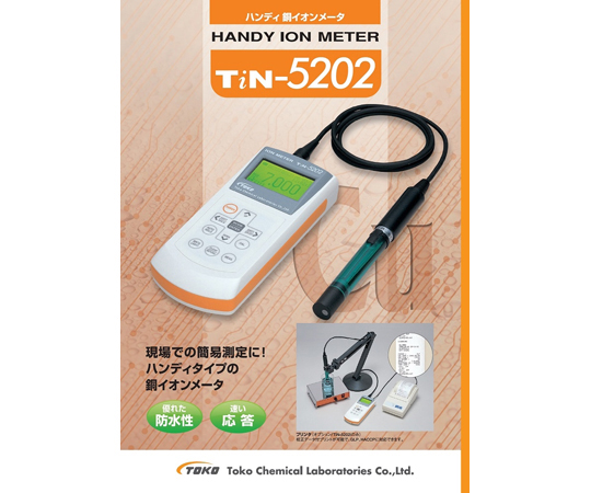 ●銅イオンを素早く、正確に、測定するハンディタイプ●TOKO銅イオンメータは、応答性、選択性に優れた固体膜イオン電極を複合化し、測定操作や洗浄等の取扱いを 容易にした銅イオンメータです●大型液晶画面に測定値と校正標準液を同時表示し、測定値の読みとりや校正濃度の確認が簡単にできます●測定濃度に合わせた校正標準液の組合せが選択でき、より精度の高い測定ができます●校正キーを押すだけの自動校正機能や、安定値を自動判断するオートホールド機能を備え、個人差の少ない測定値が得られます●耐薬品性、耐衝撃性、水滴・腐食性ガス雰囲気に強い防水構造を備え、フィールド測定でも安心してご利用いただけます●【用途】●エッチング液やメッキ液などの銅イオンの測定●排水の銅イオン管理●測定データメモリ機能付●▼最大1000データをメモリ●▼インターバル測定で自動データ保存可能●簡単操作●▼操作性を考えたキー配列●▼操作手順が画面表示●バックライト機能付●▼暗い場所でも見やすい機能●堅牢な防水機能(IP67):本体のみ●測定範囲:濃度/0.1~10000mg/L●最小表示:濃度/0.0001●再現性(計器本体):0.5%FS ±1digit●【データ保存】●▼校正データ:5個●▼随時保存:1~1000個(合計値)●▼インターバル保存:1~1000個(合計値)●▼インターバル時間:1~999分●▼電極交換記録:可●▼自動パワーオフ:ON/OFF選択設定:ON時間設定範囲 1~250分●▼バックライト点灯:時間設定範囲 1~60秒●時計機能:年、月、日、時、分、秒●電源:DC 3V(単三アルカリ乾電池 2本)●寸法(本体のみ):77(W)×40(H)×172(D)mm●質量(本体のみ):320g●【付属品】●▼標準付属電極: CE5202-SR×1●▼電極スタンド×1●▼Cu標準液:1mg/L(100mL)、10mg/L(100mL)、1000mg/L(300mL)×各1●▼イオン強度調整液 60mL×1●▼洗浄液 純水:100mL×1●▼乾電池(単三)×2●▼取扱説明書×1●▼※パンフレットのプリンター(用紙・リボン含む)・スタンド・スターラーはオプションです(尚、プリント出力機能はありません)