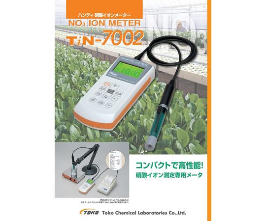 ●硝酸イオンメータは電極製造のパイオニアTOKOが開発しました●応答速度、選択性に優れたイオン電極を複合化し、取り扱いが容易で校正、測定の操作が簡単になりました●大型液晶画面に測定値と校正値を同時表示し、校正キーを押すだけの自動校正機能や、安定値を自動判断するオートホールド機能等の使いやすさに、耐薬品性、耐衝撃性、水滴・腐食性 ガス雰囲気に強い防水構造を備え、フィールド測定でも安心してご利用いただけます●測定範囲:濃度/0.6~20000mg/L●最小表示:濃度/0.0001●再現性(計器本体):0.5%FS ±1digit●【データ保存】●▼校正データ:5個●▼随時保存:1~1000個(合計値)●▼インターバル保存:1~1000個(合計値)●▼インターバル時間:1~999分●【電極交換記録】可●【自動パワーオフ】ON/OFF選択設定:ON時間設定範囲 1~250分●【バックライト点灯】●▼時間設定範囲:1~60秒●【時計機能】年、月、日、時、分、秒●【電源】DC 3V(単三アルカリ・乾電池 2本)●寸法(本体のみ):77(W)×40(H)×172(D)mm●質量(本体のみ):320g●【付属品】●▼標準付属電極:CE7002-SR×1●▼電極スタンド×1●▼標準液:100mg/L(100mL)、1000mg/L(100mL,300mL)×各1●▼イオン強度調整液 50mL×1●▼洗浄液 純水:100mL×1●▼乾電池(単三)×2●▼取扱説明書×1●▼※パンフレットのプリンター(用紙・リボン含む)・スタンド・スターラーはオプションです(尚、プリント出力機能はありません)