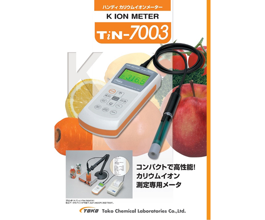 ●カリウムイオンメータは電極製造のパイオニアTOKOが開発したイオンメータです●応答速度、選択性に優れたイオン電極を複合化し、取り扱いが容易で校正、測定の操作が簡単になりました●大型液晶画面に測定値と校正値を同時表示し、校正キーを押すだけの自動校正機能や、安定値を自動判断するオートホールド機能等の使いやすさに、耐薬品性、耐衝撃性、水滴・腐食性 ガス雰囲気に強い防水構造を備え、フィールド測定でも安心してご利用いただけます●測定範囲:濃度/0.1~10,000mg/L●最小表示:濃度/0.0001●再現性(計器本体):0.5%FS ±1digit●【データ保存】●▼校正データ:5個●▼随時保存:1~1000個(合計値)●▼インターバル保存:1~1000個(合計値)●▼インターバル時間:1~999分●【電極交換記録】可●【自動パワーオフ】ON/OFF選択設定:ON時間設定範囲 1~250分●【バックライト点灯】●▼時間設定範囲:1~60秒●【時計機能】年、月、日、時、分、秒●【電源】DC 3V(単三アルカリ・乾電池 2本)●【寸法(本体のみ):77(W)×40(H)×172(D)mm●質量(本体のみ):320g●【付属品】●▼標準付属電極:CE7003-SR×1●▼電極スタンド×1●▼標準液:100mg/L(100mL)、1000mg/L(100mL,300mL)×各1●▼イオン強度調整液 50mL×1●▼洗浄液 純水:100mL×1●▼乾電池(単三)×2●▼取扱説明書×1●▼※パンフレットのプリンター(用紙・リボン含む)・スタンド・スターラー等はオプションです(尚、プリント出力機能はありません)
