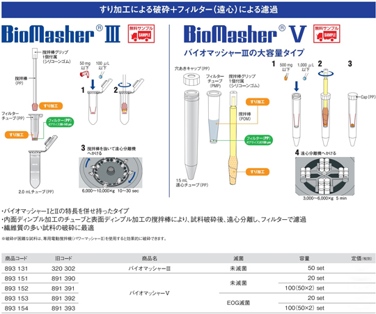 ●バイオマッシャーⅢ【すり加工+フィルター遠心】の大容量版です。●試料をすりで破砕した後にフィルターで遠心してろ過することができます。●ディスポーザブルホモジナイザー(洗う手間とコンタミの心配なし)です。●動物・植物組織からのタンパク質・RNA・DNAをはじめとする分子の抽出に適しています。●高い回収量を得られます。●撹拌棒の回転は同封(1個)されている撹拌棒グリップを用いて手動で行えます。●電動撹拌機パワーマッシャーⅡとの接続が可能です。●滅菌:未滅菌●入数:20セット(紙箱入り)●内容物:バイオマッシャーⅤ(遠心チューブ×1、フィルターチューブ×1、撹拌棒×1、穴あきキャップ×1、穴なしキャップ×1)×20セット(各滅菌袋入り)、撹拌棒グリップ×1個(滅菌袋入り)、説明書×1枚●材質:遠心チューブ・フィルター・穴あきキャップ・穴なしキャップ(PP:ポリプロピレン)、フィルターチューブ(PMP:ポリメチルペンテン)、撹拌棒(POM:ポリアセタール)、撹拌棒グリップ(シリコーンゴム)●遠心チューブ:15mL、オートクレーブ可●フィルターチューブ:先端部内側ディンプル加工、全長75mm、オートクレーブ可●撹拌棒:全長118mm、先端部表面ディンプル加工、先端部表面らせん溝付き、オートクレーブ不可●フィルター:直径7mm、ポアサイズ約100μm、オートクレーブ可●撹拌棒グリップ:全長25mm、直径10mm、オートクレーブ可●紙箱サイズ:W200×D130×H100mm●旧商品コード:891390