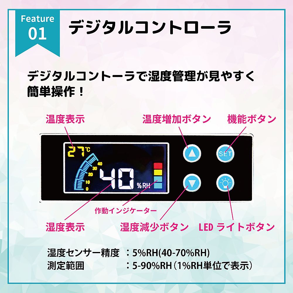 ●マイコン制御による超エコ設計の高性能ペルチェ式除湿ユニットを搭載●湿度設定機能付きデジタル湿度計を採用(電池不要)●庫内にLEDライトを搭載(コントローラーパネルでON/OFF)●使いやすい全面ワイドドアーは密閉性に優れたマグネットパッキン式(キーロック付き)●無音、無振動●中湿度用●湿度コントロール:可変式35~50%RH●キャビネット材質:スチール製●塗装:粉体塗装、ブラック●扉:ガラス、マグネットパッキン●外寸:W380×D290×H290(足含む)(mm)●内寸:W378(間口寸法345)×D245×H240(間口寸法180)(mm)●内容量:25L●重量:5kg●湿度計:デジタル式湿度計(温度計付)●電源:AC100V●消費電力:4W●付属品:キー2個、LED照明●北海道・沖縄は別途配送費が発生いたします。
