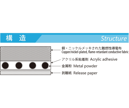 ●EMIシールドルーム、筐体接合部のシールド、電源ケーブル、信号ケーブルのシールドに適します。●導電性粘着剤を使用しているため、シールド効果を低下させません。●フレキシブルですので巻くもの貼るものに、非常にフィットします。●UL510(FR)認定品です。●材質:難燃性導電布+導電性アクリル系粘着剤●粘着剤:アクリル系粘着剤(金属粉入)●幅:40.0mm●長さ:20m●難燃性導電布厚み:250μm●粘着層厚み:50μm●合計製品厚み:300μm●表面抵抗値:0.05Ω以下/25mm□/19.6N●引張強度:縦方向324N/25mm、横方向157N/25mm●伸び:縦方向26%、横方向30%●接着力:7.1N以上/25mm●接触抵抗値:0.004Ω以下/20mm□/19.6N●難燃性:UL510FR