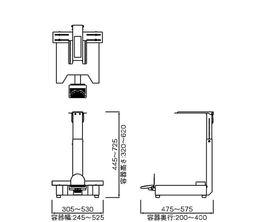 ●別売の蓋を取り付けることで、医療廃棄物用ダンボールのホルダーとして使用できます。●別売のアームを取り付けることで、医療廃棄物用樹脂製容器のホルダーとして使用できます。●容器にあわせてサイズ(幅・高さ・奥行)が変えられる可変式なので、様々なサイズのダンボール/樹脂製容器に1台で対応できます。●開閉部にはダンパーを採用しており、フタは静かに開閉する設計なので、忙しい現場や夜でも音を気にせず安心して使用できます。●踏みやすい大きなペダルを採用しています。●本体サイズ:幅305~530×奥行475~575×高さ445~725mm●重量:6.1kg●材質:アルミダイカスト・スチール●取付可能容器サイズ:幅245~525×奥行200~400×高さ320~620mm●※本製品は本体のみです。●※蓋・アームは別売です。●※医療廃棄物用ダンボール/樹脂製容器は付属していません。