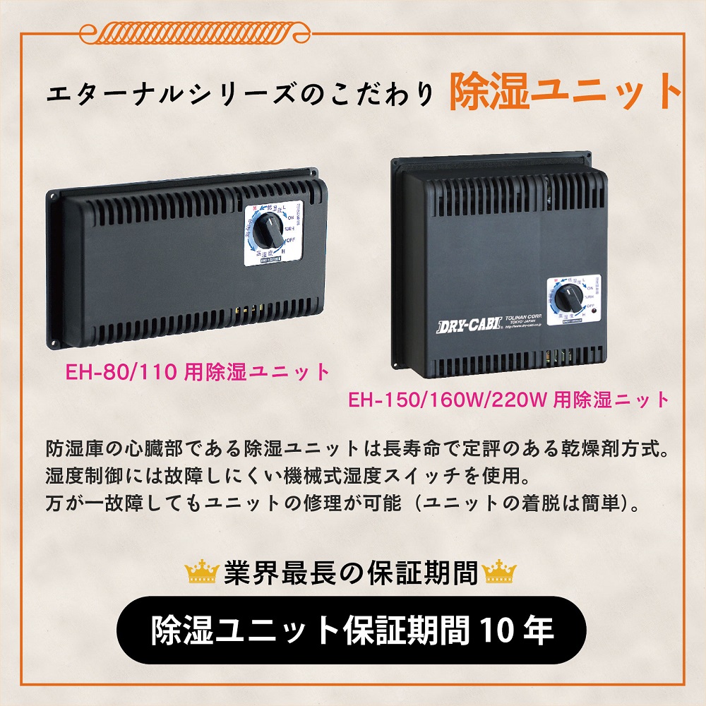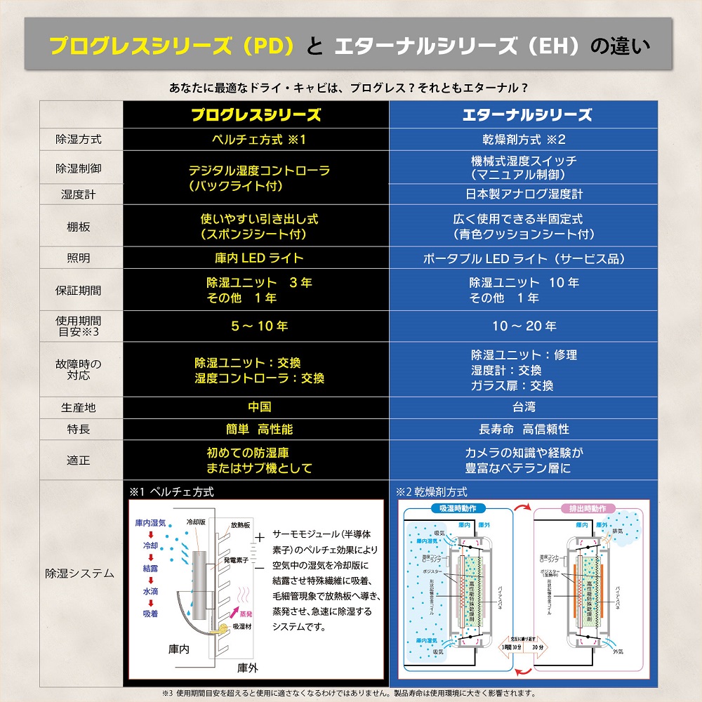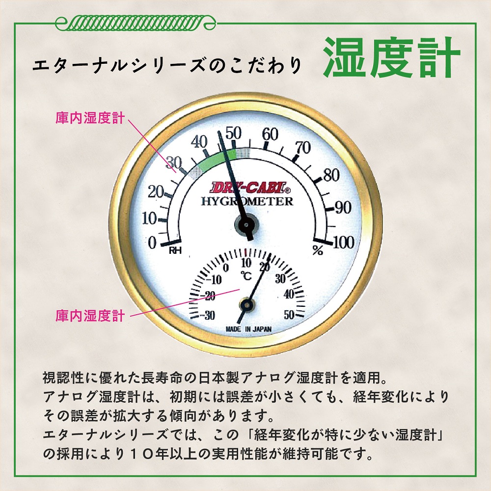 ●長期使用にこだわった高信頼性モデル(エターナルシリーズ)●長期使用で実績のある乾燥剤方式の高性能除湿ユニットを採用 ※除湿ユニットの保証期間10年●故障しにくいダイヤル式湿度調節●視認性に優れた日本製アナログ湿度計を採用。経年変化の小さいバイメタル方式で長期に渡って庫内の湿度を正確に表示●棚板は隅々まで広く使用できる半固定方式●収納品を優しく保護する青いクッションシート付き樹脂製棚板を採用 ※クッションシート付き棚板は世界でドライ・キャビのみ●除湿ユニット内の特殊乾燥剤は交換不要●塗装は環境に優しく耐久性の高い粉体塗装●無音、無振動で長期連続運転が可能●中湿度用●湿度コントロール:可変式30~50%RH●除湿方式:乾燥剤方式除湿ユニット・ダイヤル自動調節式●キャビネット材質:スチール(粉体塗装、ブラック)●外寸:W400×D375×H643(足18mm含む)(mm)●内寸:W398(間口寸法360)×D315×H564(間口寸法544)(mm)●内容量:77L●重量:11kg●湿度計:アナログ湿度計●電源:AC100V●消費電力:16W●付属品:棚板2枚、キー2本、ポータブルLED灯、トレー●棚板耐荷重:50kg