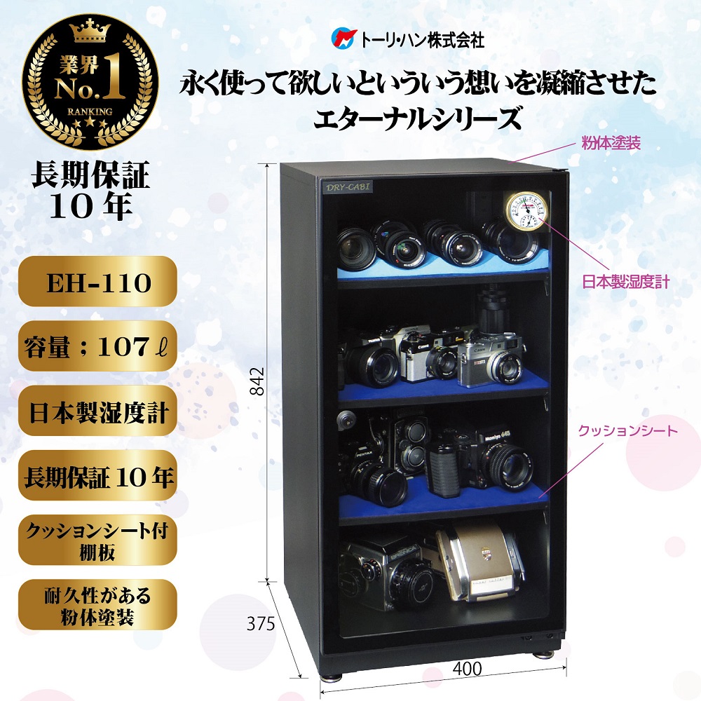 ●長期使用にこだわった高信頼性モデル(エターナルシリーズ)●長期使用で実績のある乾燥剤方式の高性能除湿ユニットを採用 ※除湿ユニットの保証期間10年●故障しにくいダイヤル式湿度調節●視認性に優れた日本製アナログ湿度計を採用。経年変化の小さいバイメタル方式で長期に渡って庫内の湿度を正確に表示●棚板は隅々まで広く使用できる半固定方式●収納品を優しく保護する青いクッションシート付き樹脂製棚板を採用 ※クッションシート付き棚板は世界でドライ・キャビのみ●除湿ユニット内の特殊乾燥剤は交換不要●塗装は環境に優しく耐久性の高い粉体塗装●無音、無振動で長期連続運転が可能●中湿度用●湿度コントロール:可変式30~50%RH●除湿方式:乾燥剤方式除湿ユニット・ダイヤル自動調節式●キャビネット材質:スチール(粉体塗装、ブラック)●外寸:W400×D375×H842(足18mm含む)(mm)●内寸:W398(間口寸法360)×D315×H763(間口寸法743)(mm)●内容量:107L●重量:14kg●湿度計:アナログ湿度計●電源:AC100V●消費電力:16W●付属品:棚板3枚、キー2本、ポータブルLED灯、トレー●棚板耐荷重:50kg