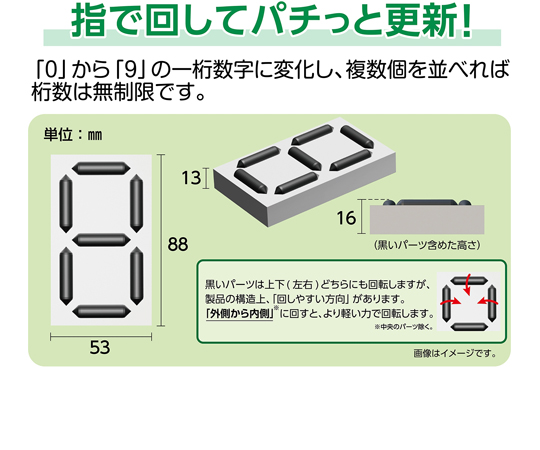 ●指一本でパーツを半回転させるだけで簡単に数字を更新できます。●「0」から「9」の一桁数字に変化し、複数個を並べれば桁数は無制限です。●「数字のみ立体」で正面は勿論、上下左右からの視認性にも優れています。●ホワイトボードやスチール製ボードなどに脱着可能な裏面マグネット付きです。●数字の更新に札本体の脱着は不要です。●数字札を使用したオリジナル品の制作は別途見積いたします。●裏面マグネット付●取付仕様:マグネットタイプ●サイズ:縦88×横53×厚さ16mm●質量(g):50●材質:本体/ABS樹脂、マグネット/塩素化ポリエチレン・フェライト●※黒いパーツは上下(左右)どちらにも回転しますが、製品の構造上、「回しやすい方向」があります。「外側から内側」に回すと、より軽い力で回転します。(※中央のパーツ除く)