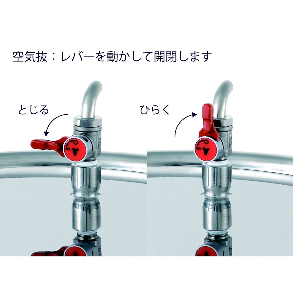 ●薬品などの液体の小分けがしやすいボールバルブ付きのステンレス容器に、レベル計・空気抜・脚を付けました。●蓋にある空気抜(バルブ)を操作するだけで、蓋を開けることなく密閉状態を解除でき、スムーズに液体を排出できます。●容器はパッキン付きで、保管や持ち運びの際に中身の飛散やホコリの侵入を防ぐ密閉タイプです。●排出口のバルブはステンレス製で、ねじ込み部のシールもPTFEのため耐薬品性に優れています。●ノズルの先端はねじ込み継手になっており、配管への接続もできます。●背の高いビーカー・ボトルにも給水できるように、ノズルまでの高さを200mmにしました。●脚には10mmの穴が空いているため、アンカーやネジで固定することもできます。●容量:20L●本体重量:5.4kg●サイズ:容器/内径×全高:300×567mm●材質●▼本体・蓋:SUS304●▼パッキン:シリコンゴム(食品衛生法適合品)【PQA】●▼ニップル:SUS304●▼ボールバルブ(排出口):SCS14●▼ボールバルブ(空気抜):SCS13●▼両ニップル:SUS304●▼ねじ込みエルボ:SUS304●▼ユニオン継手:SUS316●▼チューブ:PFA●▼平鋼脚:SUS304/板厚3mm/幅25mm/本数3本/φ10mm穴付●表面処理:内外面バフ研磨●使用条件:大気圧(加減圧不可)●※容器サイズによりキャッチクリップの数が異なります。