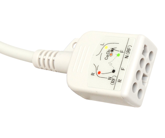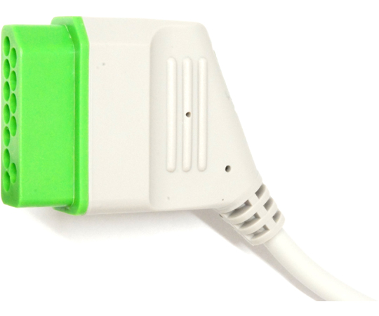 ●繰り返しの洗浄、消毒が可能な高耐久性ラテックスフリー、医療グレードTPU素材を用いています。●シールド特性に優れ、電気的ノイズを低減します。●IECカラーコードにより、装着位置の識別が容易になっています。●ANSI/AAMI EC53に適合しています。●日本光電12ピン矩形ソケット付き心電計と日本光電DBR-903/906リード線を接続する日本光電 ECG EKG 6の互換製品です。●6線仕様ですが、日本光電BR-903など3線のECGリード線も使用できます。●リード線長:270cm●リード線数:6本●ECG側コネクタ:日本光電互換12ピン矩形プラグ●リード線側コネクタ:日本光電互換2×4穴矩形ソケット●材質:TPU(ケーブル)●カラーコード:IEC