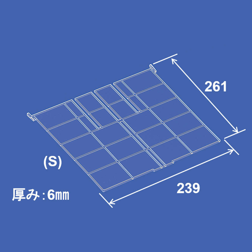 ●クリア素材のため内容物の視認性に優れます。●サンボックス#22-5専用の中仕切です。●中仕切LとSを組み合わせてボックスの内を最大12分割まで可能です(S3枚、L2枚使用)。●材質:特殊樹脂●外寸(mm):261×239×6