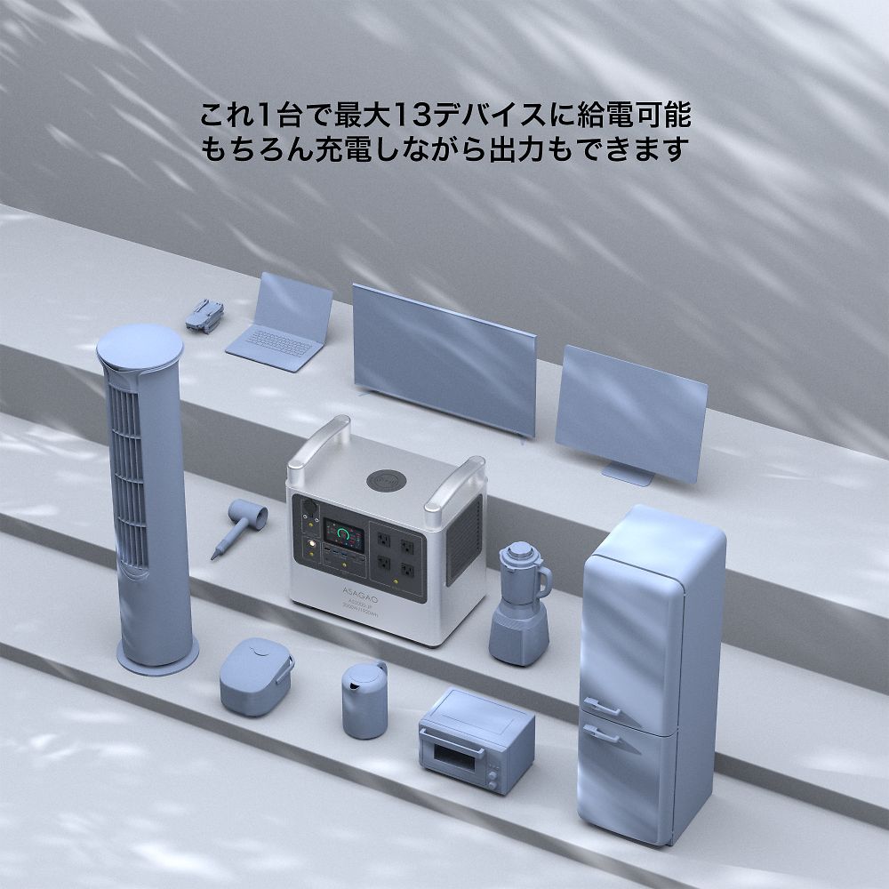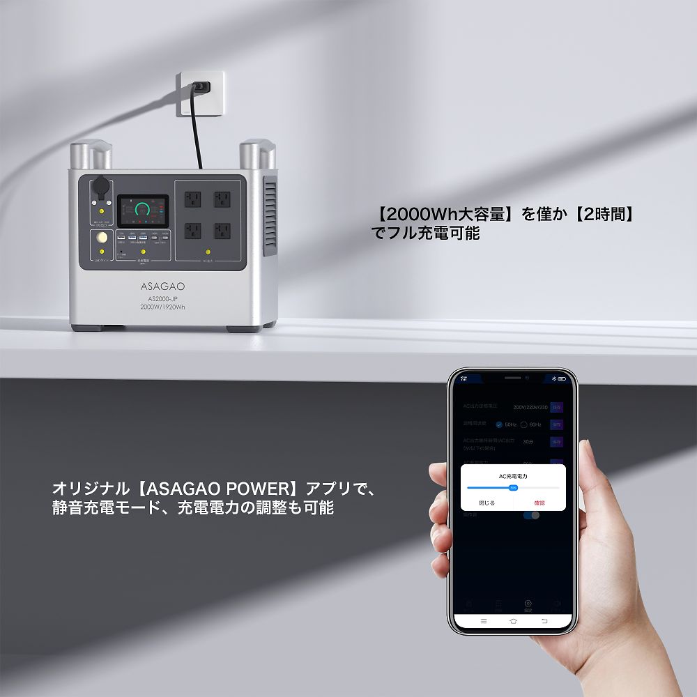 ●高い安全性:リン酸鉄リチウムイオン電池を搭載●長寿命:3000回繰り返し充電後、残量70%以上維持(1放電サイクルは、0→100%まで充電すること)●日常から非常時まで幅広く使用可能です。●常時接続OK:ACコンセントに常時接続しても問題なく●長期保管対応:フル充電の状態で約5年間保管可能で、メンテナンスの手間がかかりません●カテゴリ最長クラスの本体5年の長期保証(3年+会員登録で2年追加)●2000Whの大容量で約20Kgを実現●背面ラベルにクイック操作ガイドを印刷●本体印字は全て日本語表記●持ちやすい大型ハンドル●0~100% 2時間以内の超高速充電●充電速度を専用アプリから任意に設定可能、急いでない場合はゆっくり充電することでバッテリーへの保護を最大限に●入力しながら出力可能●ワイヤレス充電機能が搭載、最大13デバイスに同時出力可能●独自の「αBOOST機能」で最大2,800W出力を実現●パススルーと電源自動切替機能(UPS)搭載停電時業界最速10ms以内実測定値5.4msで商用電源からAS2000-JP出力に切り替える。●デスクトップ・ルーター・複合機などの精密機器へのバックアップ電源として適任。●電源復帰時、ASAGAOオリジナルの位相追従システムを搭載することによって、AS2000-JPの電圧位相を商用電源に合わせてから切り替え、位相のズレがなく、ノイズが少なく、高品質な純正弦波を提供することを実現させる。●全高調波歪(THD)が僅か1.2%とクリーンな電源を提供、音響・精密機器などに利用可能●冷蔵庫などのような休眠モードに入る電化製品と低消耗電力の電化製品にも継続的に給電可能●AC出力電圧を専用アプリから100V・110V・120Vに設定可能、一部輸入電化製品にも負担をかけず稼働可能●世界基準の安全性能を実現し、さらに世界で最も厳しいと言われているジャパンクオリティを基準に●防災認定協会から災害時に安全で有用な製品として認定されています●サイズ(幅 ×奥行き×高さ):本体サイズ/355×227×347mm●重量:本体重量/20.5kg●本体素材:アルミ合金(頑丈で、カラーコーティングにより腐食や傷・ショートからも保護されています。)●セルタイプ:リン酸鉄リチウム●電池パック定格容量・電圧:1920Wh(48V)●電池充電サイクル寿命:2000回80% 3500回70%●AC入力:100V ( 50Hz / 60Hz ) 最大1300W、充電電力をASAGAO専用アプリから1300Wの1%単位で設定可能、パススルー・自動切替(10ms以内)●MPPT(ソーラー)入力:10~50V / 最大11A、最大500W●シガーソケット入力:12V / 8A 24V /10A●商用コンセント充電時間:充電残量0から100%充電まで→2時間●ソーラーチャージャー充電時間:充電残量0から100%充電まで→最短約6時間(純正200Wソーラーパネルを2枚接続時・最大200W/理論値)●AC出力(4口):100V~120V ×4ポート, 50Hz / 60Hz(手動切替)定格2,000W(サージ5,000W)αBOOSTモード:2800W MAx 過負荷・短絡保護機能搭載●AC出力電圧設定:アプリから100V/110V/120Vに設定可能●全高調波歪(THD):1.2%●AC出力5W以下での維持時間設定(ASAGAO冷蔵庫モード):アプリから30分、1時間、2時間、4時間、常時ONなどに設定可能●パススルー&自動切替機能(UPS):10ms以内(実測定値5.4ms)●アプリ制御:ASAGAO POWERオリジナルアプリ WIFI&Bluetooth両方対応●USB出力(5口):USB-Aポート ×1(12W)、USB-A急速ポート×2(QC3.0、18W)、USB-C急速ポート×2(5~20V/20A、100W)●ACC出力(1口):ACC(車載アクセサリ)ソケット ×1(13.2V/10A 132W Max)●DC出力(2口):DC 5525(センタープラス)ポート ×2(13.2V/10A 132W Max)●ワイヤレス充電(1口):15W×1●使用環境温度:-10~45°C※結露なき事●充電温度範囲:0~40°C※結露なき事●保管温度範囲:0~40°C※結露なき事●環境湿度:≦85%RH●長期保存時推奨充電率:50%~70%(高温多湿を避けて保管)●待機電流:<500μA