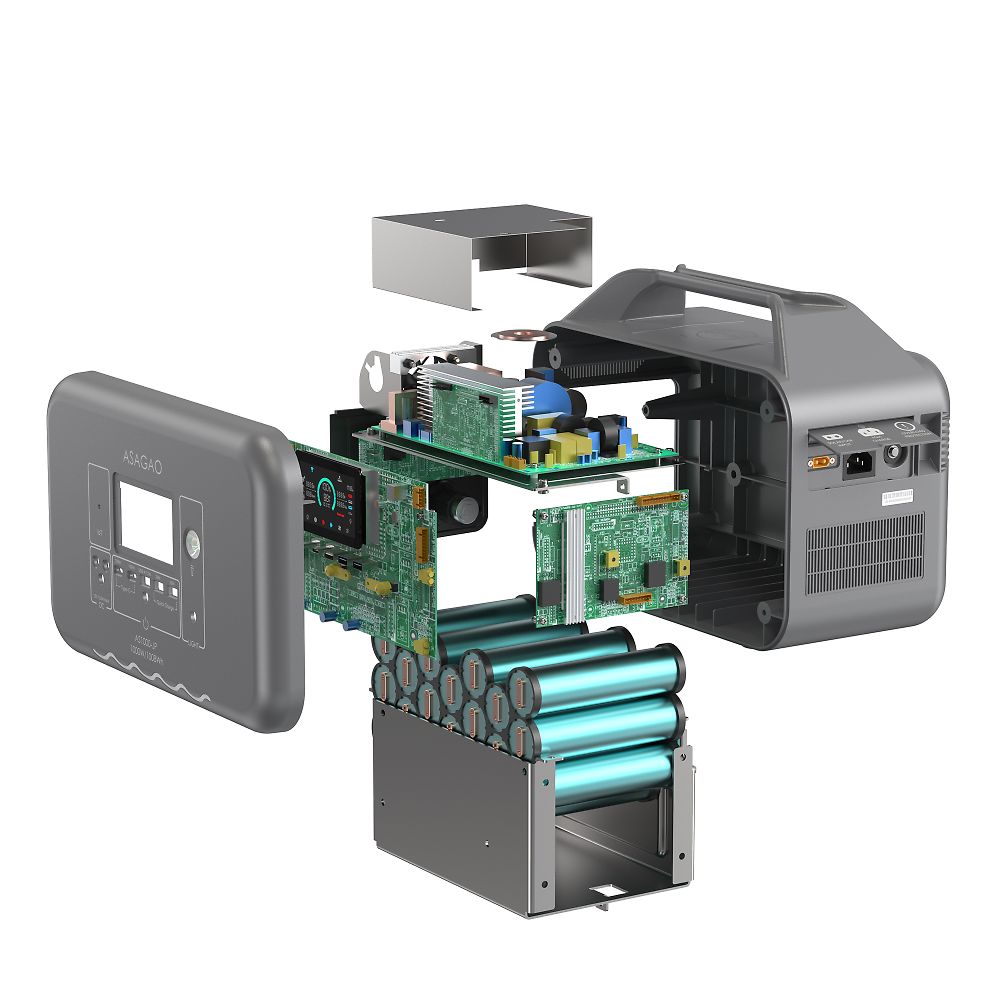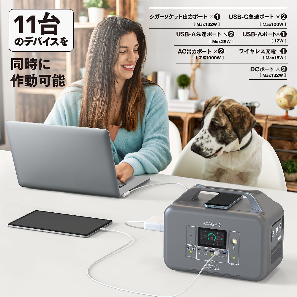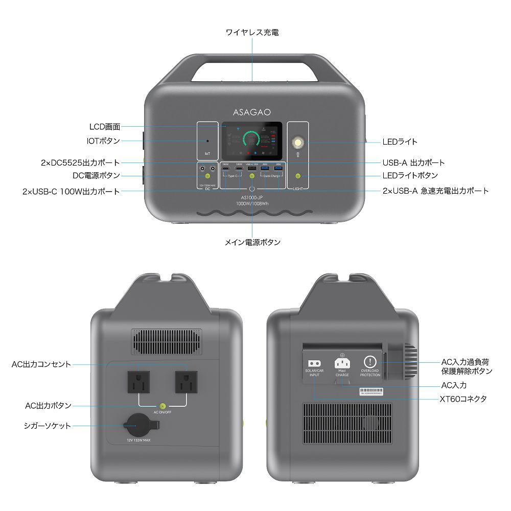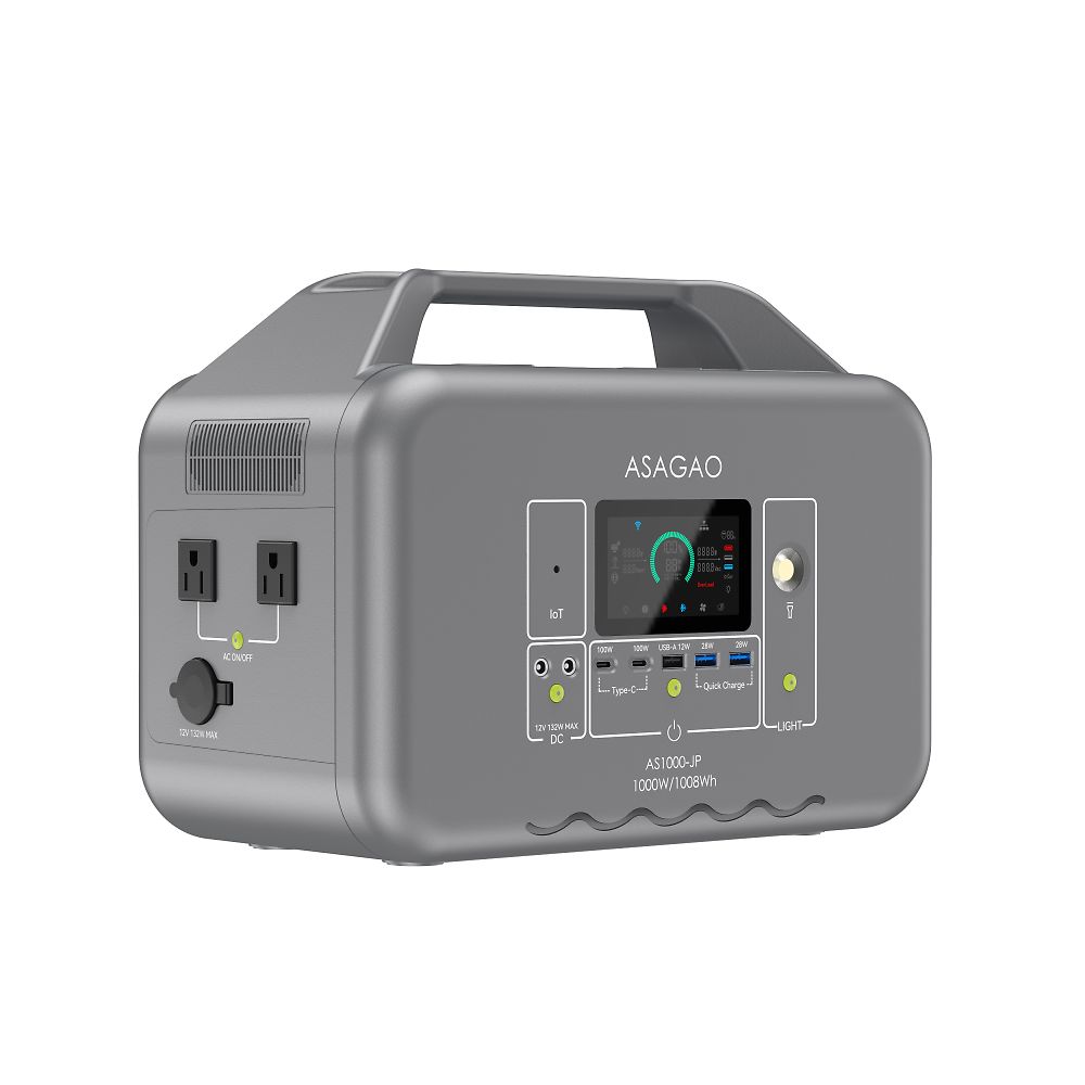 ●高い安全性:リン酸鉄リチウムイオン電池を搭載●長寿命:3000回繰り返し充電後、残量70%以上維持(1放電サイクルは、0→100%まで充電すること)●日常から非常時まで幅広く使用可能です。●常時接続OK:ACコンセントに常時接続しても問題なく●長期保管対応:フル充電の状態で約5年間保管可能で、メンテナンスの手間がかかりません●カテゴリ最長クラスの本体5年の長期保証(2年+会員登録で3年追加)●0~100% 1.5時間以内の超高速充電●充電速度を専用アプリから任意に設定可能、急いでない場合はゆっくり充電することでバッテリーへの保護を最大限に●入力しながら出力可能●ワイヤレス充電機能が搭載、最大11デバイスに同時出力可能●独自の「αBOOST機能」で最大1,800W出力を実現●パススルーと電源自動切替機能(UPS)搭載停電時業界最速10ms以内9実測定値4ms)で商用電源からAS1000-JP出力に切り替える。●デスクトップ・ルーター・複合機などの精密機器へのバックアップ電源として適任。●電源復帰時、ASAGAOオリジナルの位相追従システムを搭載することによって、AS1000-JPの電圧位相を商用電源に合わせてから切り替え、位相のズレがなく、ノイズが少なく、高品質な純正弦波を提供することを実現させる。●全高調波歪(THD)が1.5%とクリーンな電源を提供、音響・精密機器などに利用可能●冷蔵庫などのような休眠モードに入る電化製品と低出力電力の電化製品にも継続的に給電可能●AC出力電圧を専用アプリから100V・110V・120Vに設定可能、一部輸入電化製品にも負担をかけず稼働可能●世界基準の安全性能を実現し、さらに世界で最も厳しいと言われているジャパンクオリティを基準に●防災認定協会から災害時に安全で有用な製品として認定されています●サイズ(幅 ×奥行き×高さ):本体サイズ/340×192×262mm●重量:本体重量/11.7kg●セルタイプ:リン酸鉄リチウム●電池パック定格容量・電圧:1008Wh(22.4V)●電池充電サイクル寿命:2000回80% 3500回70%●AC入力:100V ( 50Hz / 60Hz ) 最大800W、充電電力をASAGAO専用アプリから800Wの1%単位で設定可能、パススルー・自動切替(10ms以内)●MPPT(ソーラー)入力:10~30V / 最大10A、最大200W●シガーソケット入力:12V / 8A 24V /8A●商用コンセント充電時間:充電残量0から100%充電まで→1.5時間●ソーラーチャージャー充電時間:充電残量0から100%充電まで→最短約6時間(純正200Wソーラーパネルを1枚接続時・最大200W/理論値)●AC出力(2口):100V~120V ×2ポート, 50Hz / 60Hz(手動切替)定格1,000W(サージ3,000W) αBOOSTモード:1800W MAx 過負荷・短絡保護機能搭載●AC出力電圧設定:アプリから100V/110V/120Vに設定可能●全高調波歪(THD):1.5%●AC出力5W以下での維持時間設定(ASAGAO冷蔵庫モード):アプリから30分、1時間、2時間、4時間、常時ONなどに設定可能●パススルー&自動切替機能:10ms以内(実測定値5.4ms)●アプリ制御:ASAGAO POWERオリジナルアプリ WIFI&Bluetooth両方対応●USB出力(5口):USB-Aポート ×1(12W)、USB-A急速ポート×2(QC3.0、18W)、USB-C急速ポート×2(5~20V/20A、100W)●ACC出力(1口):ACC(車載アクセサリ)ソケット ×1(13.2V/10A 132W Max)●DC出力(2口):DC 5525(センタープラス)ポート ×2(13.2V/10A 132W Max)●ワイヤレス充電(1口):15W×1●使用環境温度:-10~45°C※結露なき事●充電温度範囲:0~40°C※結露なき事●保管温度範囲:0~40°C※結露なき事●環境湿度:≦85%RH●長期保存時推奨充電率:50%~70%(高温多湿を避けて保管)●待機電流:<500μA