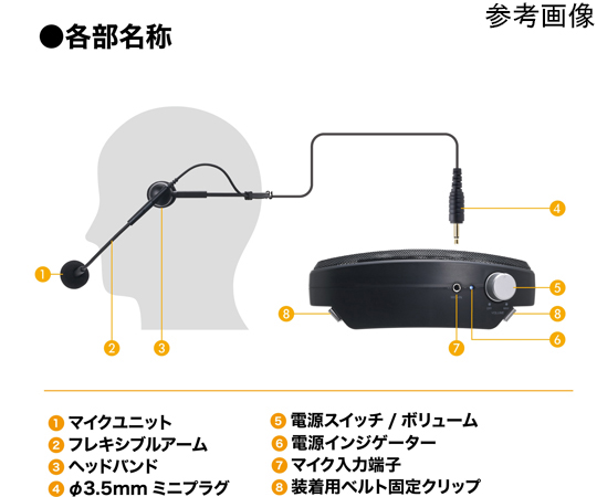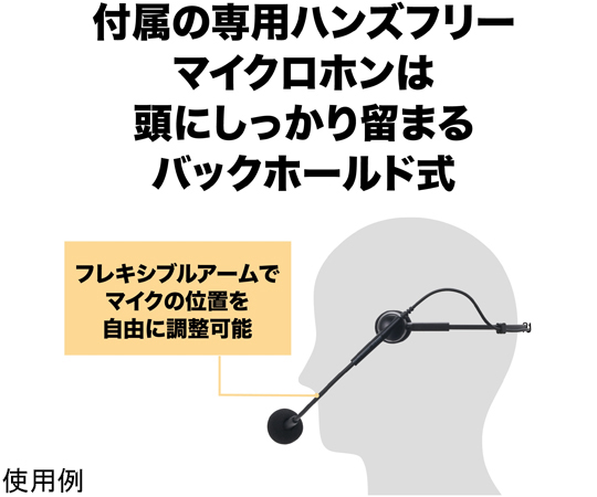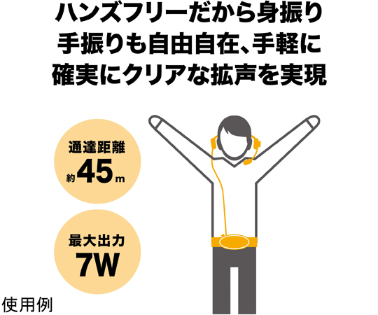 ●ハンズフリーだから身振り手振りも自由自在、手軽に確実にクリアな拡声を実現●45m先まで声が届くハンズフリー拡声器●ハンズフリー拡声器 ATP-SP303●▼電源(別売):DC9V(単3形乾電池×6)●▼電池寿命:マンガン乾電池使用時 約4時間(JEITA)、アルカリ乾電池使用時 約8時間●▼質量(電池,ベルト除く):約340g●▼ベルト調整可能サイズ:ウエスト55~100cm●▼通達距離:約45m●▼周波数特性:300~20kHz(±10dB)●ハンズフリーマイクロホン AT810S●▼型式:ダイナミック型●▼指向特性:単一指向性(ハイパーカーディオイド)●▼周波数特性:200~8kHz●▼感度(0dB=1V/Pa,1kHz):-54.5dB●▼出力インピーダンス:600Ω●▼質量:約25g●▼コード:1.2m(φ2.8mm)●▼プラグ:φ3.5mm金メッキモノラルミニ●▼使用温度範囲:0℃~40℃●▼マイク入力端子:φ3.5mmモノラルジャック(AT810S専用)●アンプ部●▼定格出力:5W●▼最大出力:7W●▼SN比:60dB●▼消費電流(1W出力時):500mA●スピーカー部●▼スピーカーユニット:6.6cmフルレンジコーン 6W、4Ω●▼最大入力:10W●▼定格入力:6W●▼出力音圧レベル:86±2dB