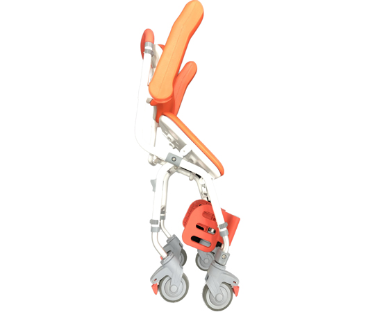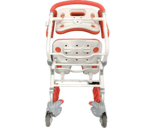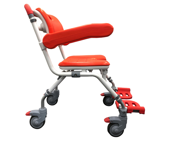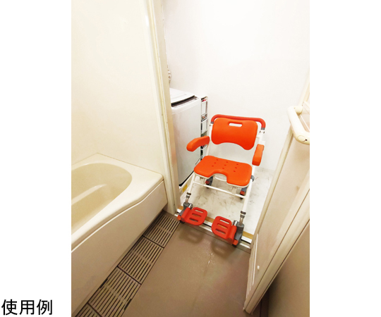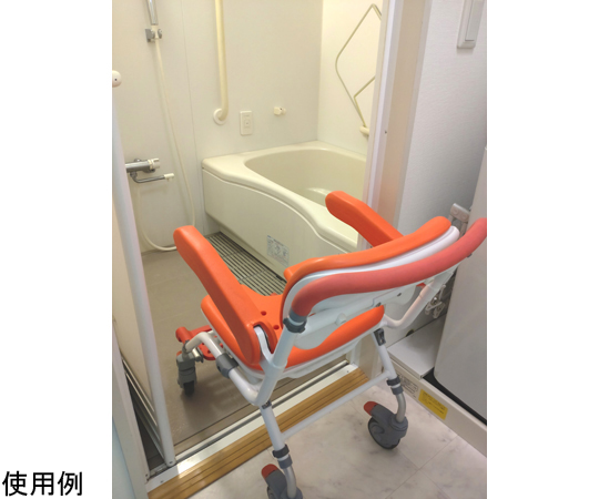 ●安全にお風呂に入ることができ、さらにキャスターで移動もできるシャワーチェアです。●コンパクトで小回りが利くため、居宅・施設問わずご使用いただけます。●肌に触れるパッド、ラバー部分は抗菌・防カビ加工を施しています。●ストッパーはワンプッシュで車輪の進行と方向転換の回転両方にロックがかかり安全です。●立ち上がりの際に足を妨げないよう、フットレストは開閉収納式を採用しています。●座面の高さは450/470/500mmと3段階に調節可能です。●折りたたみができるので使わないときはコンパクトに収納できます。(自立不可)●シャワーヘッドホルダー付属。●カラー:レッドオレンジ●本体サイズ:約W490×H770×D745mm(座面低設定時)●折りたたみサイズ:約W490×H1000×D400mm(座面低設定時)●座面パットサイズ:約W420×D320×t28mm●重量:約9.8kg●耐荷重100kgまで●折りたたみ:可能(自立不可)●アームレスト:はね上げ可動●フットレスト:はね上げ可動●キャスターサイズ:φ100mm4インチ×4個●主な材質:アルミ、ステンレス、EVA、TPE●メンテナンス販売部材:背・座パッド、アームレストパッド、固定ピン、シャワーヘッドホルダー、左右各前輪用フットレスト付きキャスター、左右共通後輪用キャスター