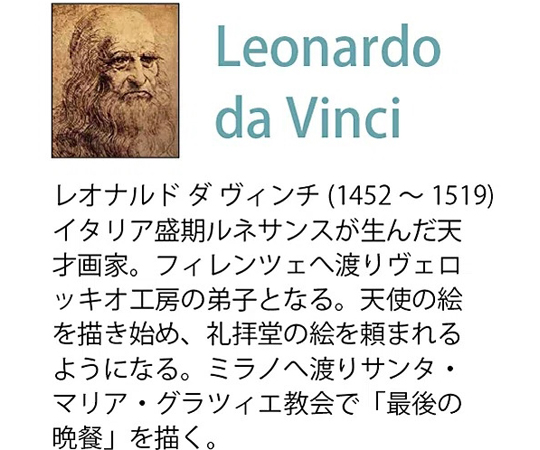 ●絵の表面を特殊ゲル加工しているため、油絵のような質感です。●サイズ:W109×H44×D3.5cm●重さ:約2.4kg●作家:レオナルド ダヴィンチ(イタリア男性作家)●※作家の詳細ルネサンス全盛期の天才画家。ヴィンチ村とその郊外で幼少期を過ごす。フィレンツェへ渡りヴェロッキオ工房の弟子となる。天使の絵を描き始め、礼拝堂の絵を頼まれるようになる。ミラノへ渡り、サンタマリアグラツィエ教会で「最後の晩餐」を描く。●材質:樹脂フレーム●絵の表面を特殊ゲル加工●生産国:日本